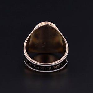 Antique Garnet Mourning Ring: This antique mourning ring dates to the Georgian era and features a large garnet cabochon set in 18k gold. The band is adorned with white and black enamel and is engraved with a memorial inscription 'RobT Young-OB:3Nov:1803 AET:54'.