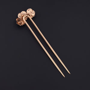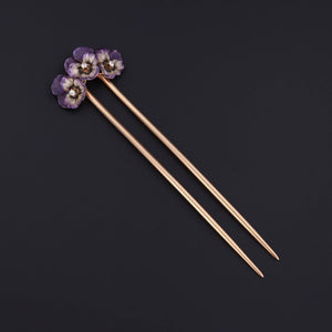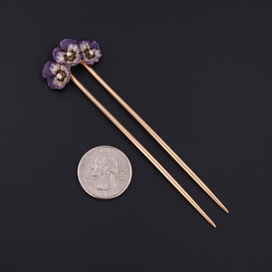 Antique Enamel and Diamond Pansy Hair Pin of 14k Gold