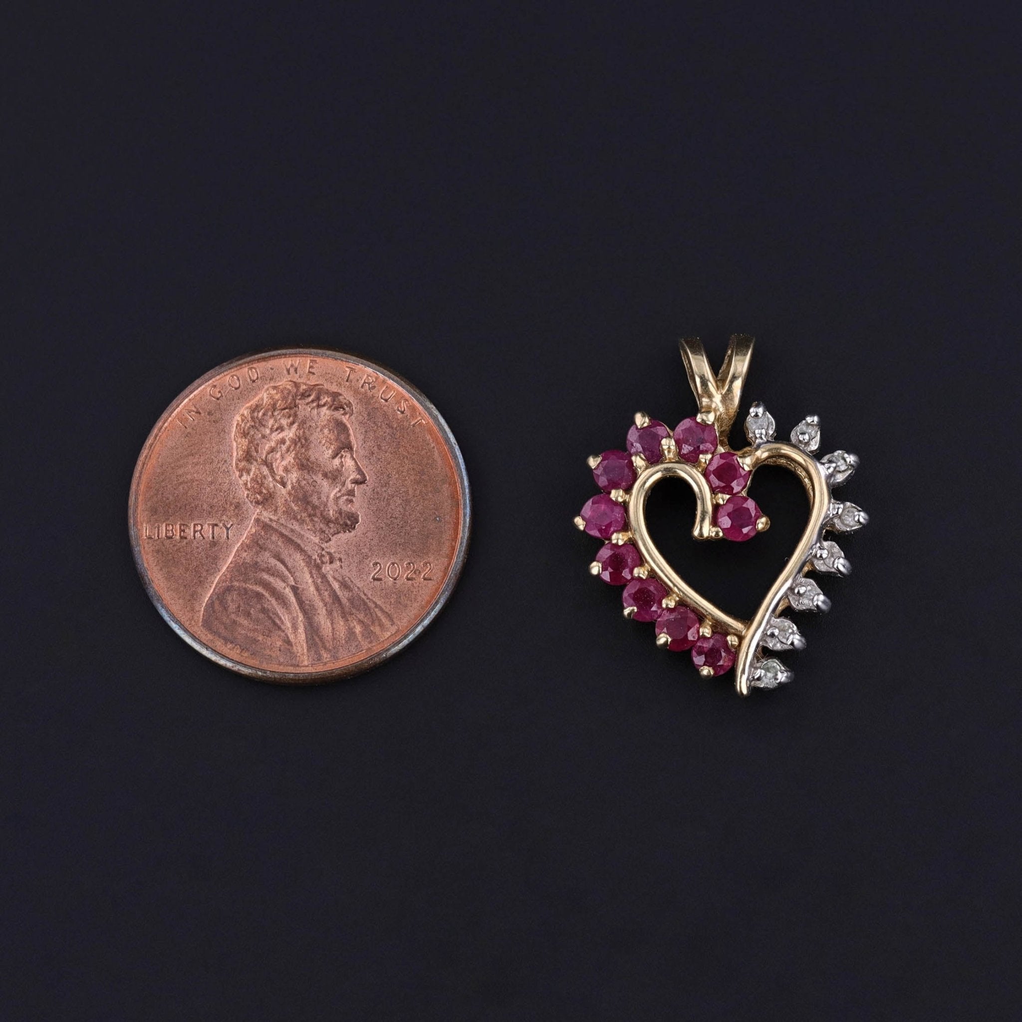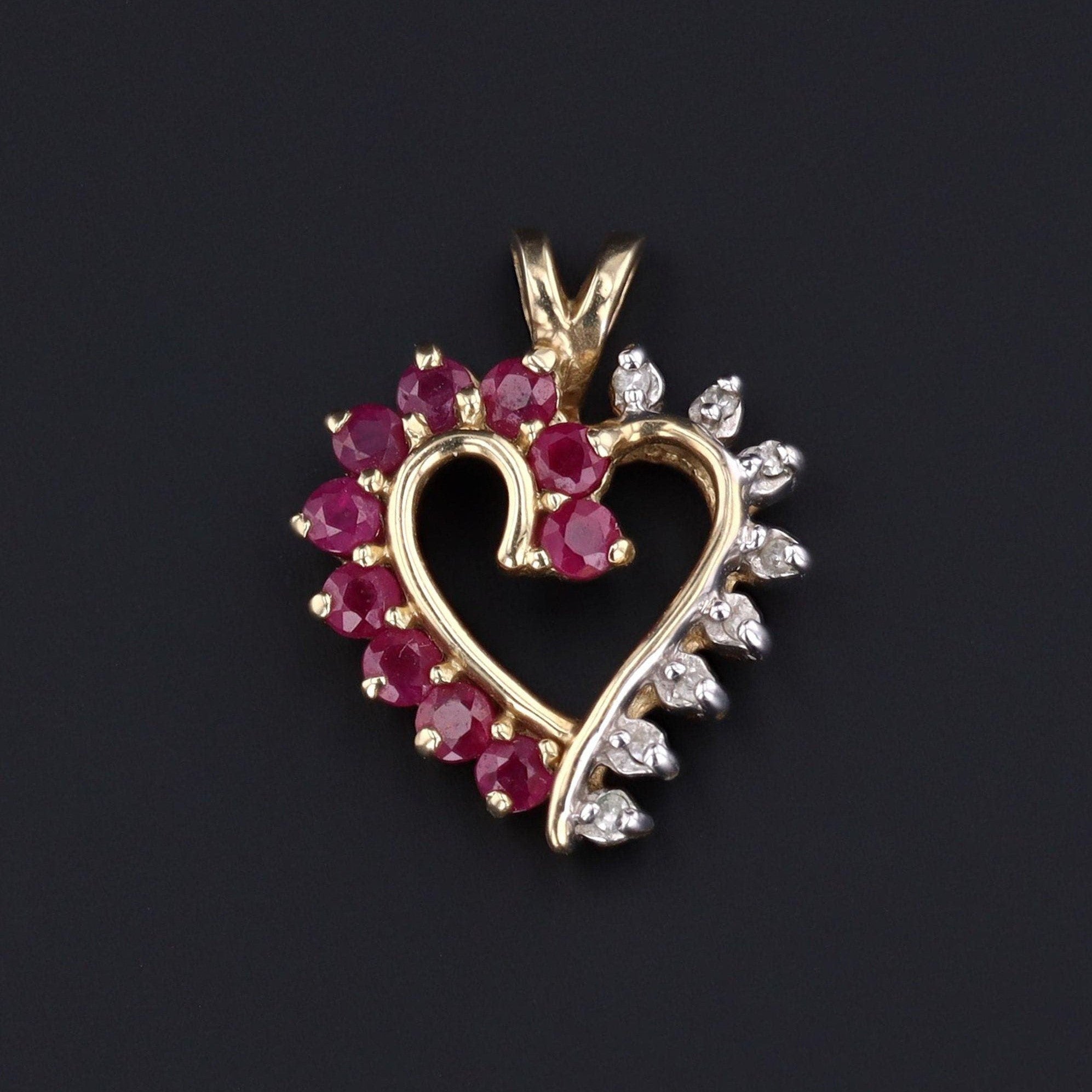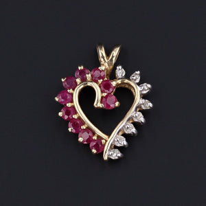 A glistening ruby and diamond heart pendant, this jewel is a timeless symbol of unending love. Crafted in 14k gold during the 1980s, the design pairs vibrant rubies with sparkling diamonds, their contrasting hues bringing both warmth and brilliance to the classic heart motif.