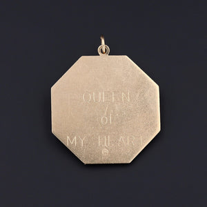 The substantial mid-20th century pendant is 14k gold weighs 11.3 grams. The piece is accented with rubies and sapphires and the reverse is engraved Queen of My Heart.