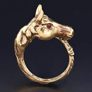 The ring is a size 5.75 and is in excellent condition, with the gold retaining its warm luster and the details remaining crisp and well-defined. A standout piece for equestrian jewelry lovers, animal motif collectors, or anyone who appreciates sculptural vintage gold rings, this piece combines whimsical charm with timeless sophistication.