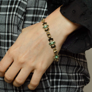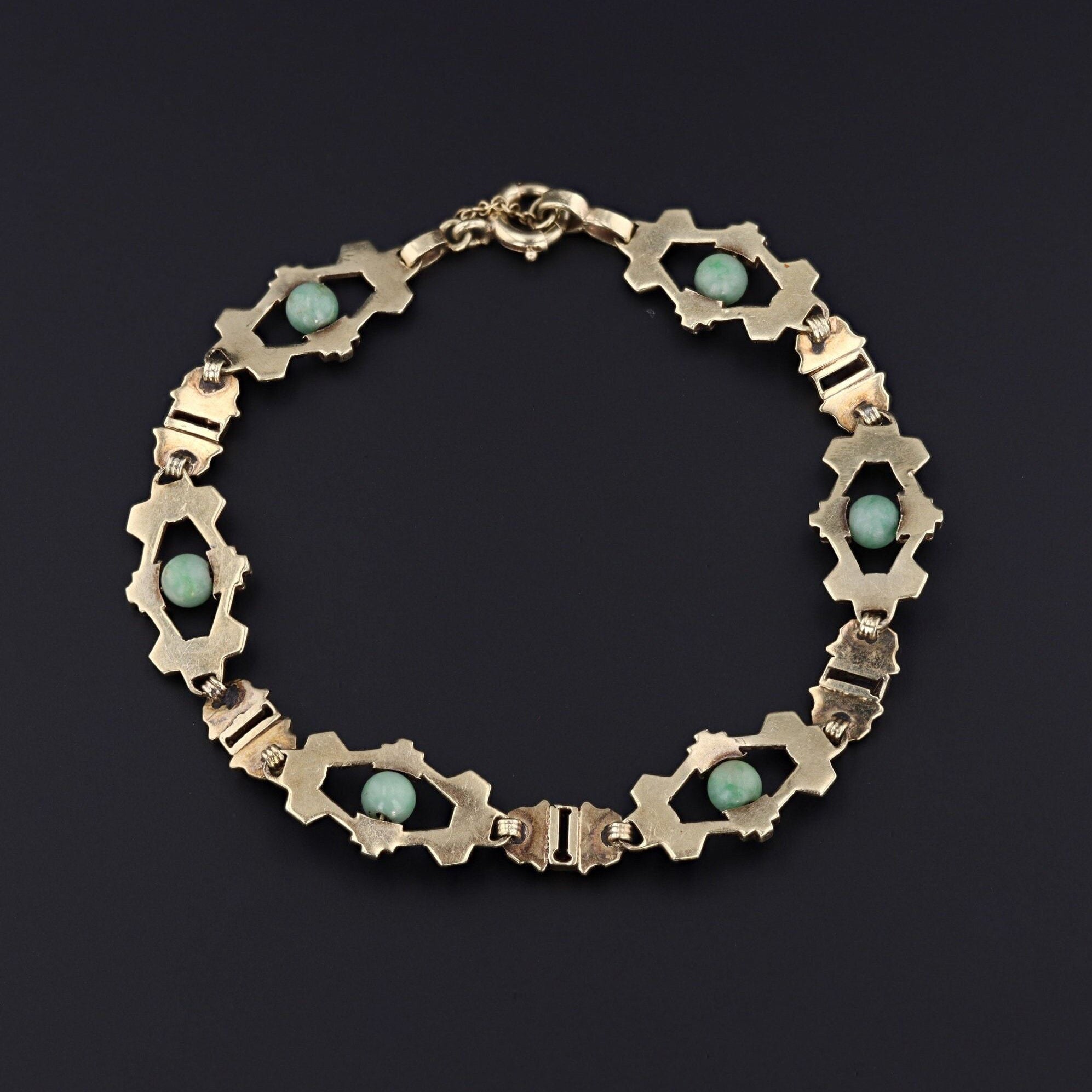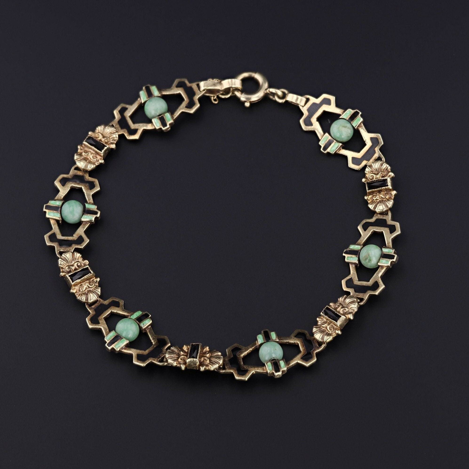This vintage bracelet (circa 1920) features six minty green and black enamel links accented with jade beads. The bracelet is 14k gold (marked) and in very good condition.