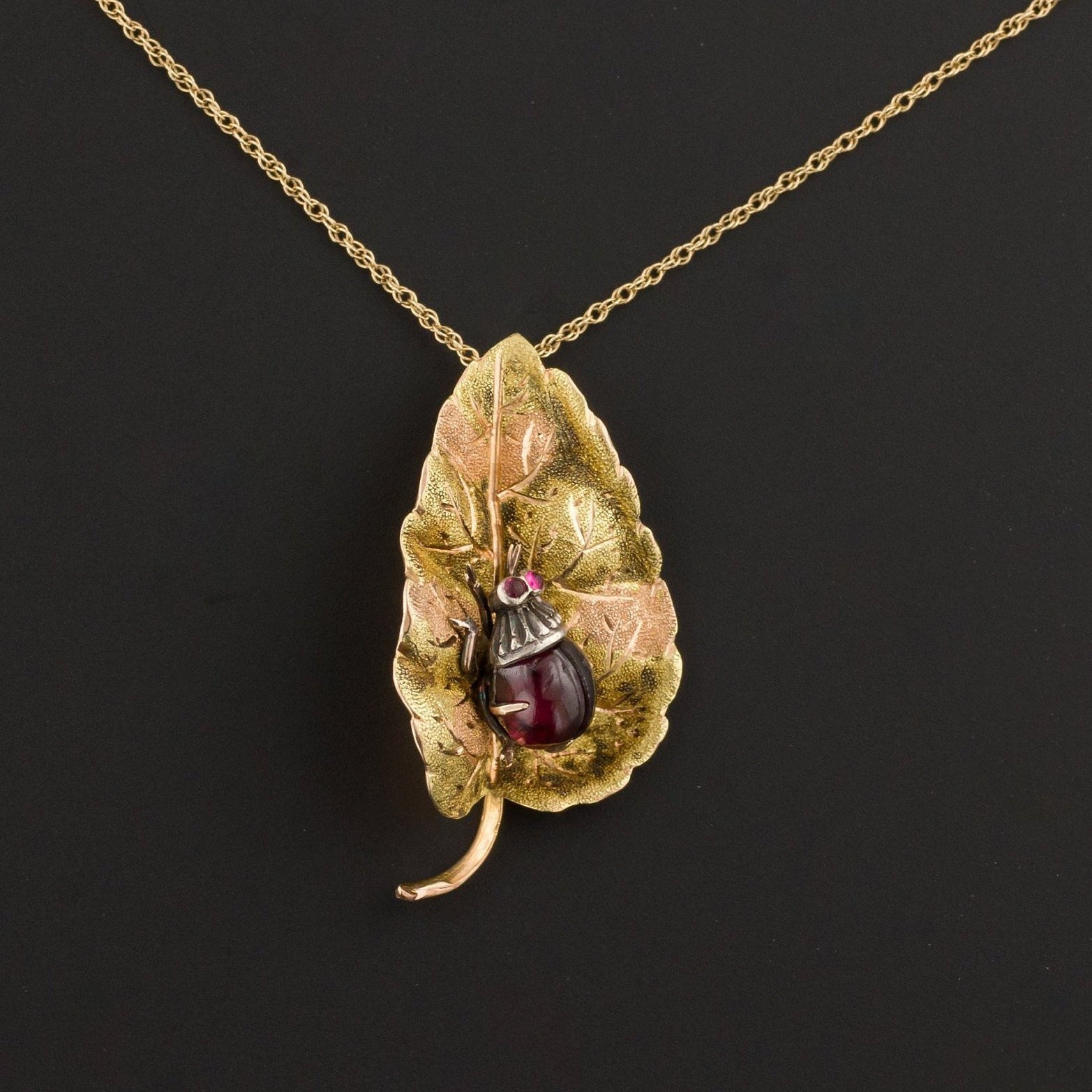 This unique antique garnet pendant was originally a brooch before our jeweler transformed it with the addition of a hidden 10k gold bail. The pendant features a textured 9ct yellow gold leaf with a rose and green gold overlay. A garnet ladybug rests atop the leaf like a charming totem.