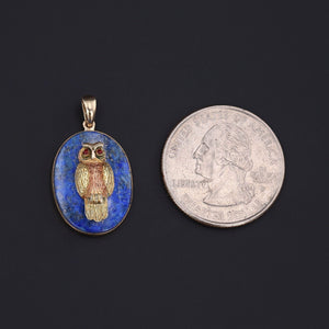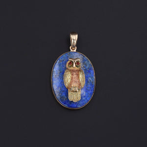 We created this unique pendant by taking lapis from a vintage 14k gold cufflink (circa 1950) and mounting on a 9ct gold owl from a 1910s era brooch.