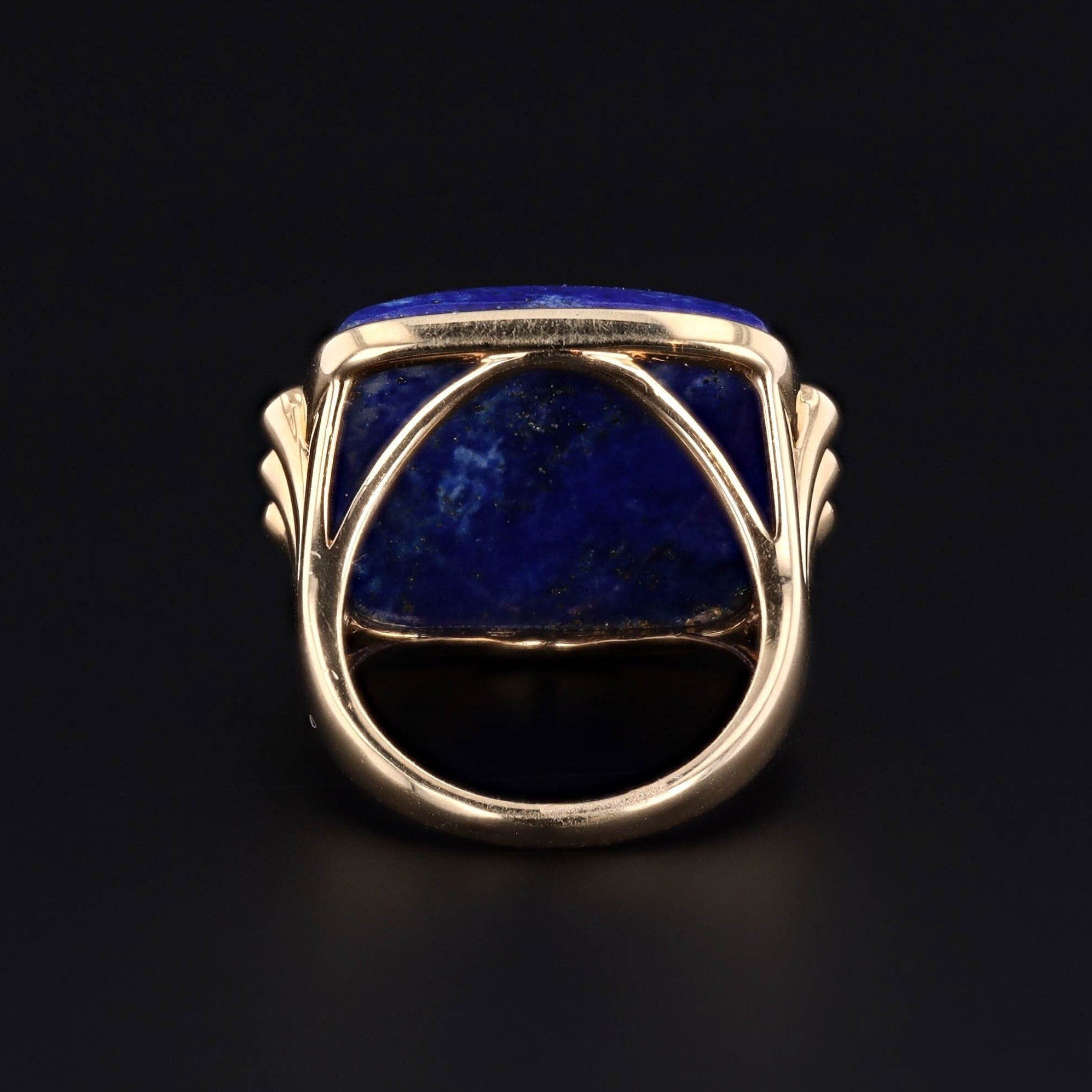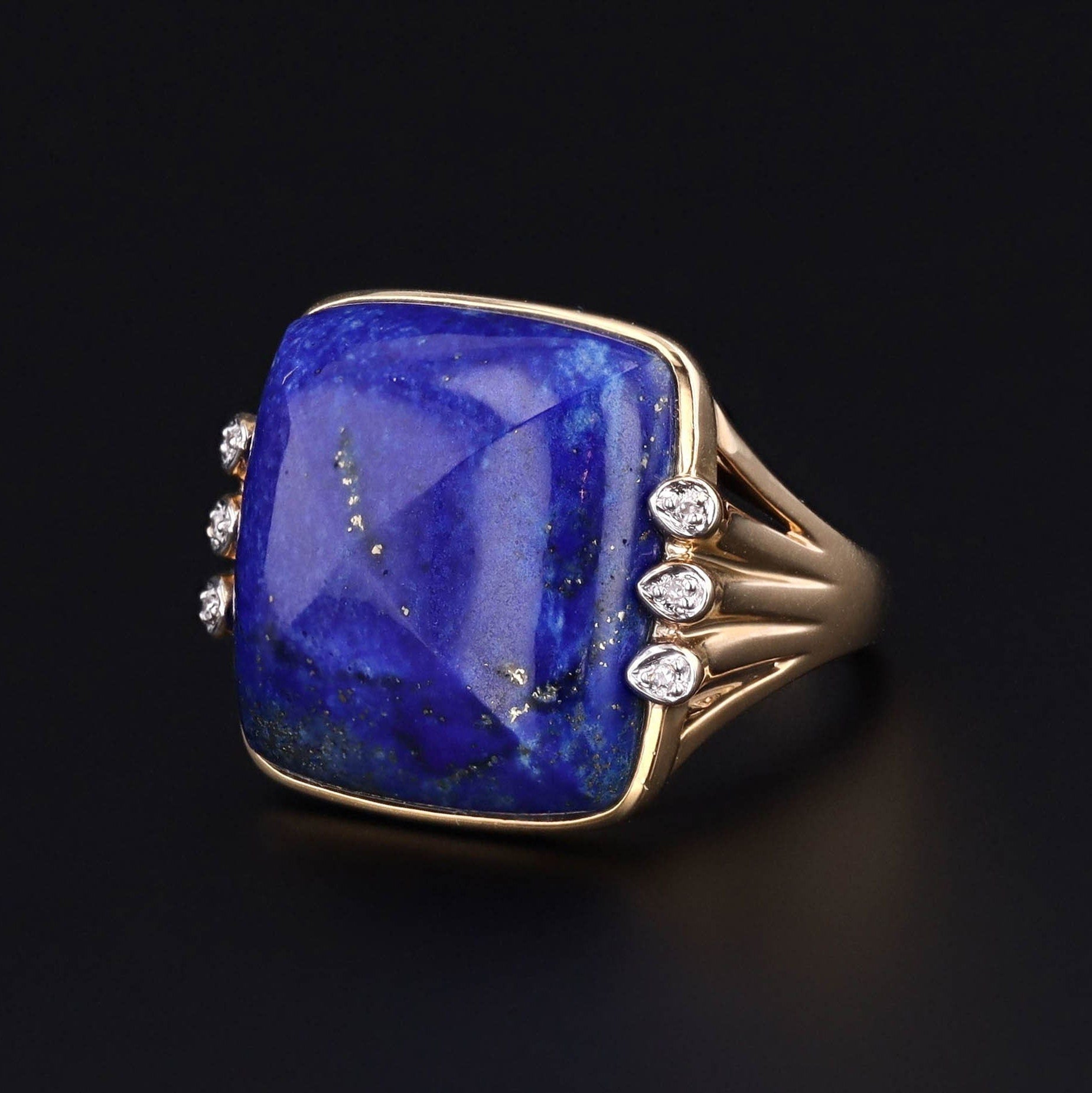 This vintage 14k gold ring (circa 1960-1970) features a square lapis lazuli flanked by diamonds.
