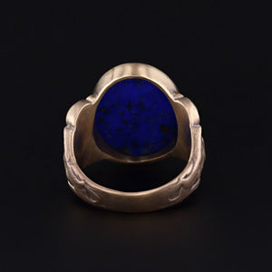 This sphinx ring features a dramatic lapis cabochon set into a mounting that we cast and reproduced from an antique signet ring. The 14k gold mounting features a sphinx on either side of the stone.