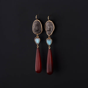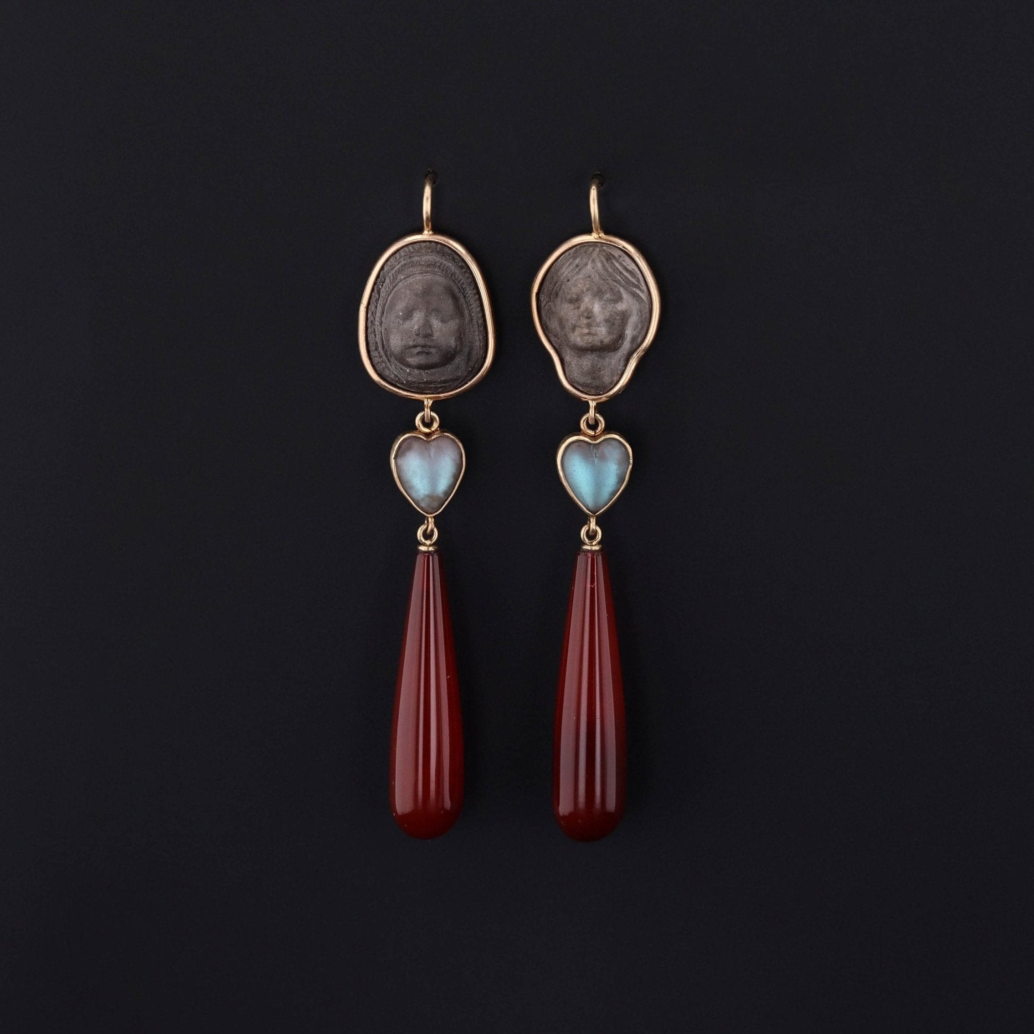 We created these alluring one-of-a-kind 14k gold earrings by combining Victorian lava faces (circa 1870-1890), antique saphiret hearts (circa 1900), and vintage carnelian drops.