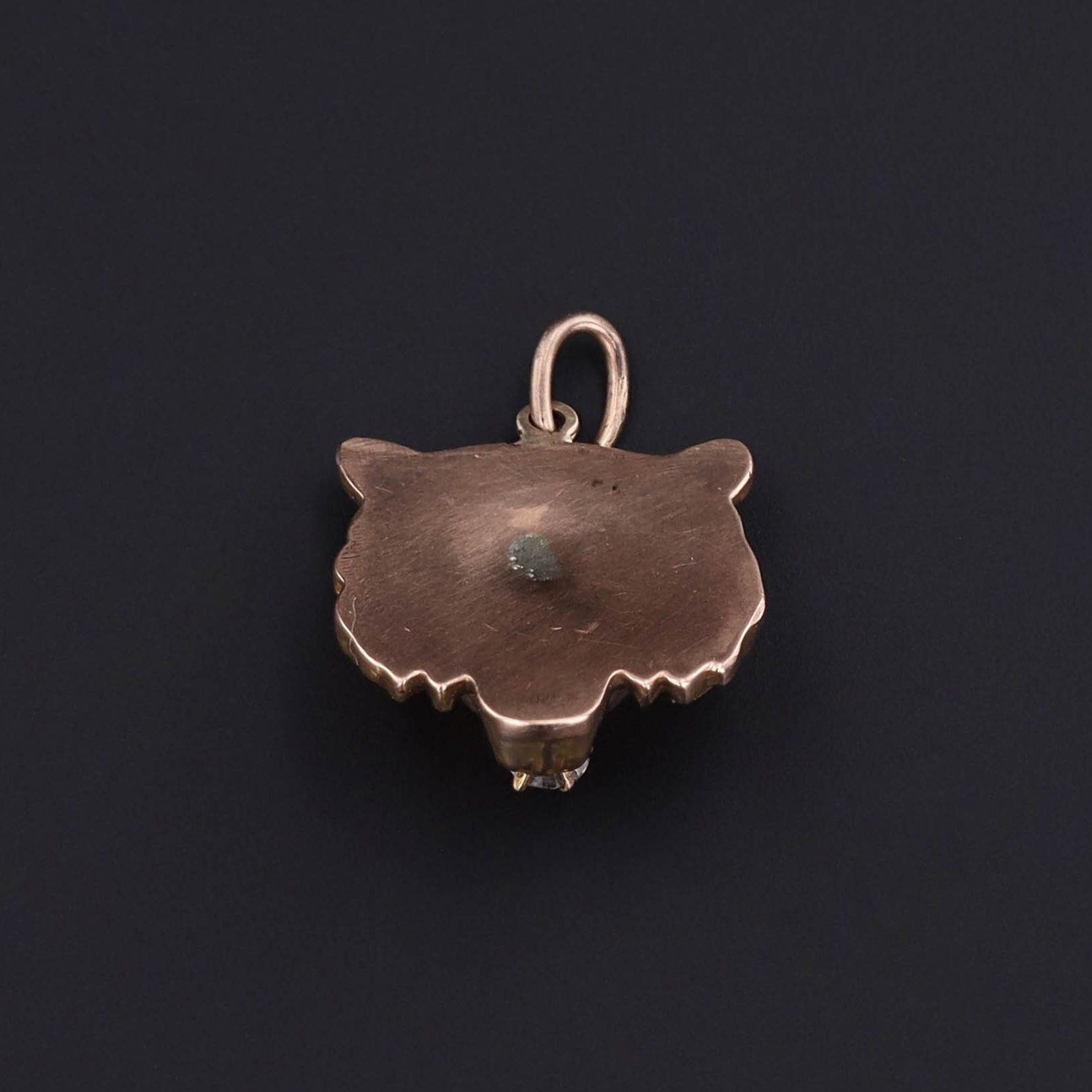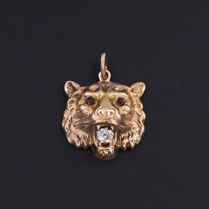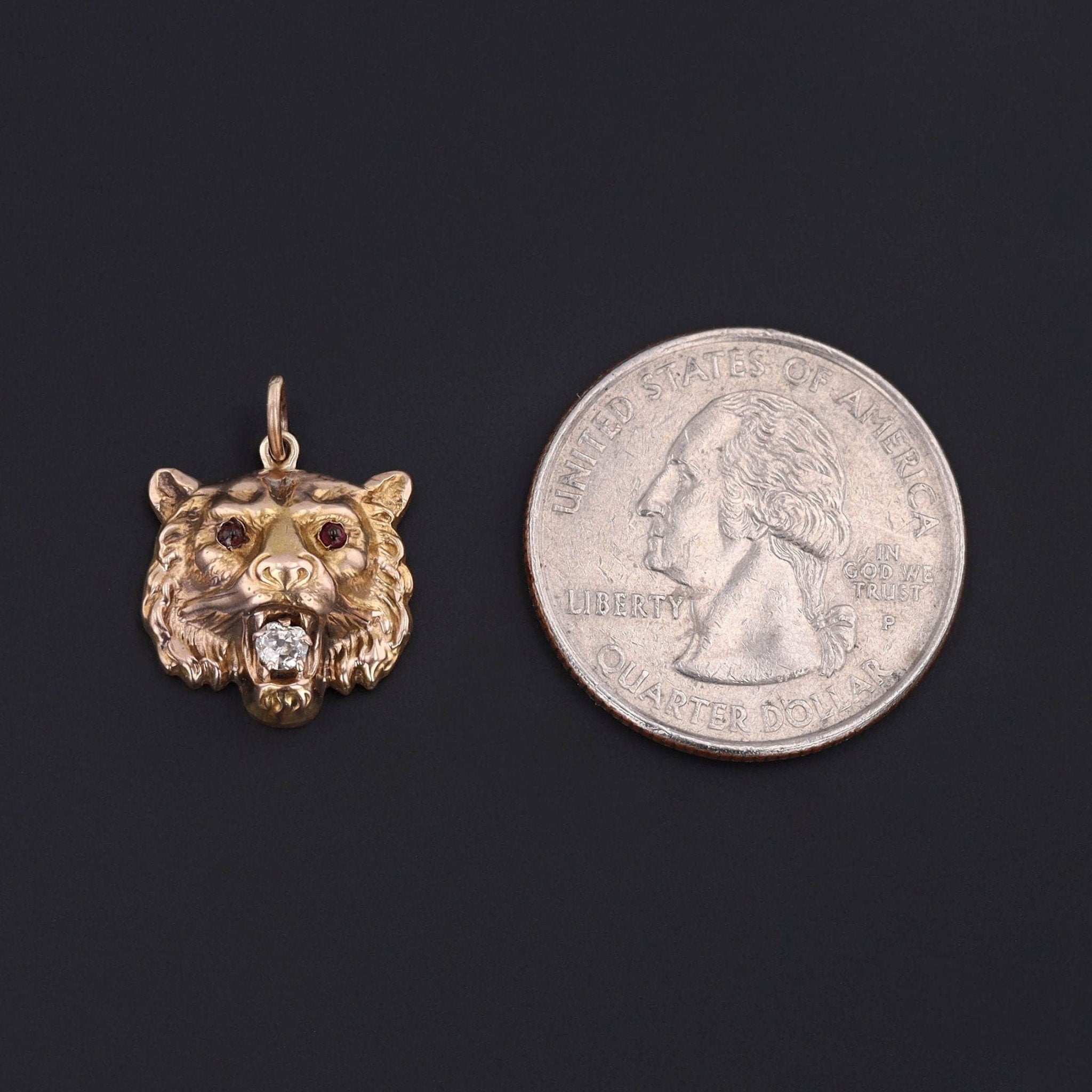 This antique lion was originally an antique stick pin (circa 1910-1920). It is 9ct gold and the lion holds a glittering diamond in its teeth. The eyes are red glass.