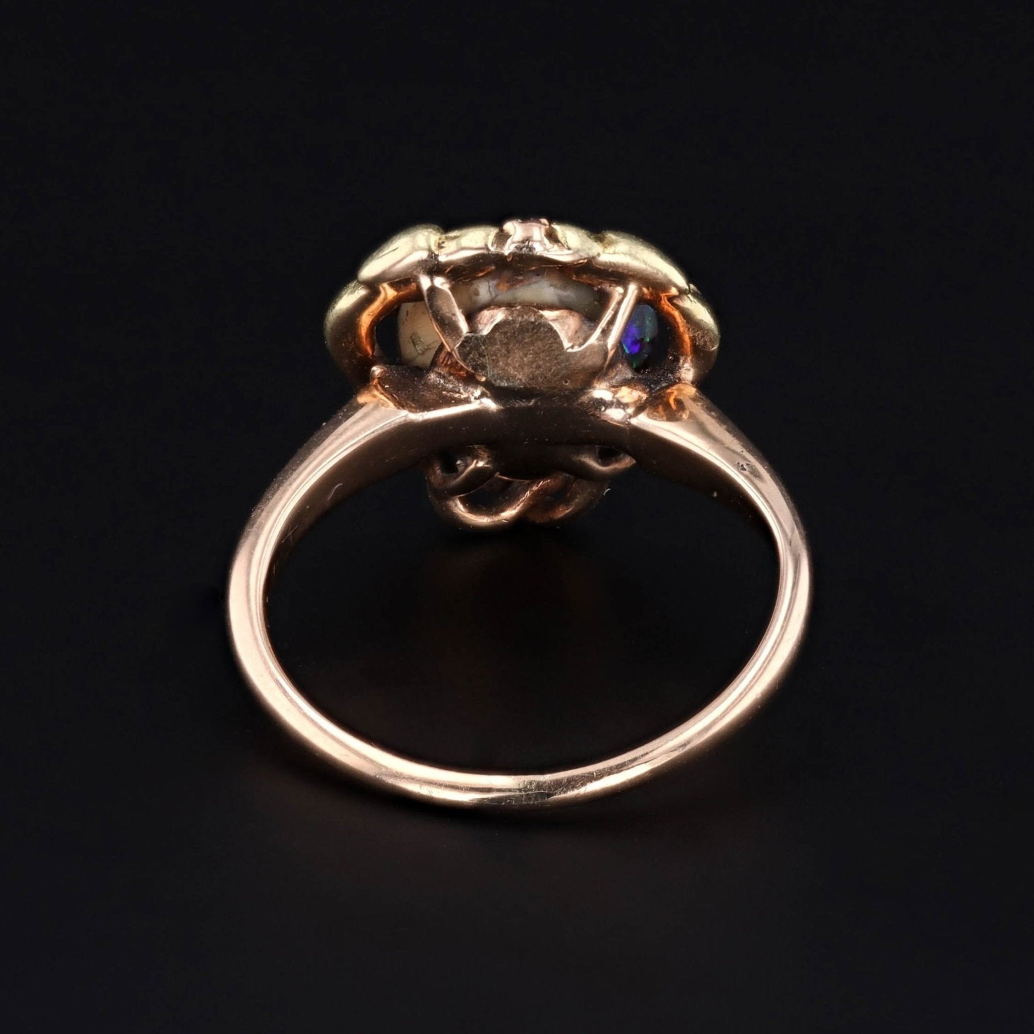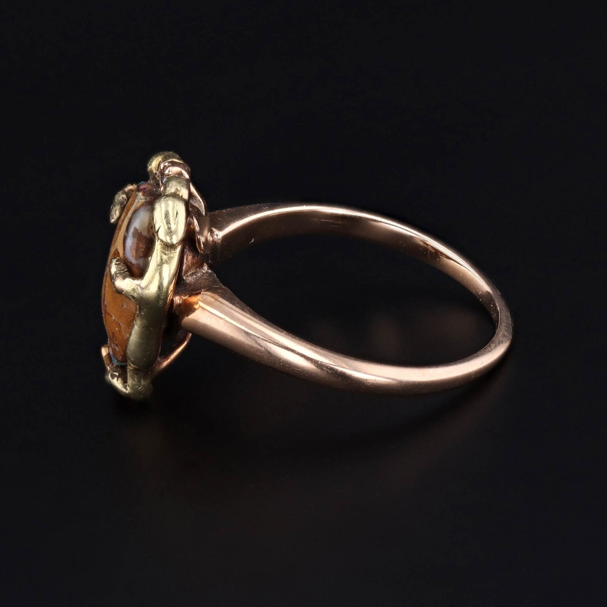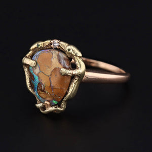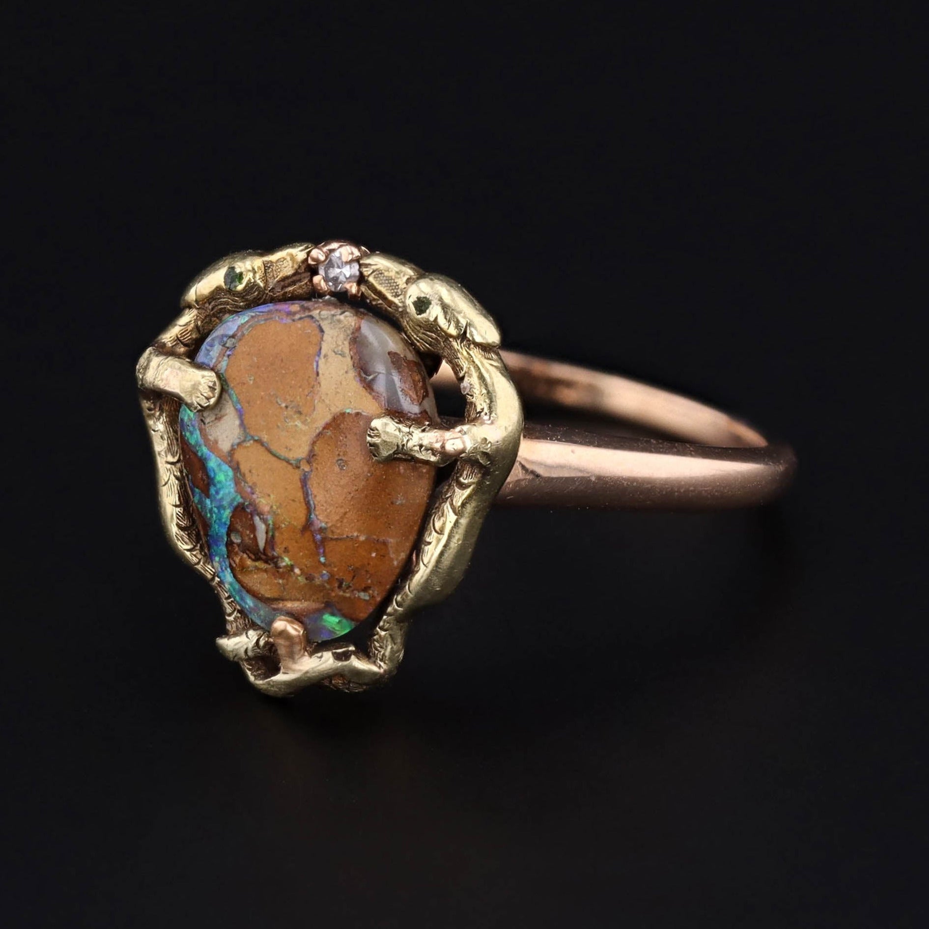 This fun asymmetrical ring depicts two entwined lizards holding boulder opal. The face of the ring was originally an antique 14k gold stick pin (circa 1910) transformed with the addition of a vintage 14k gold band.