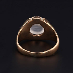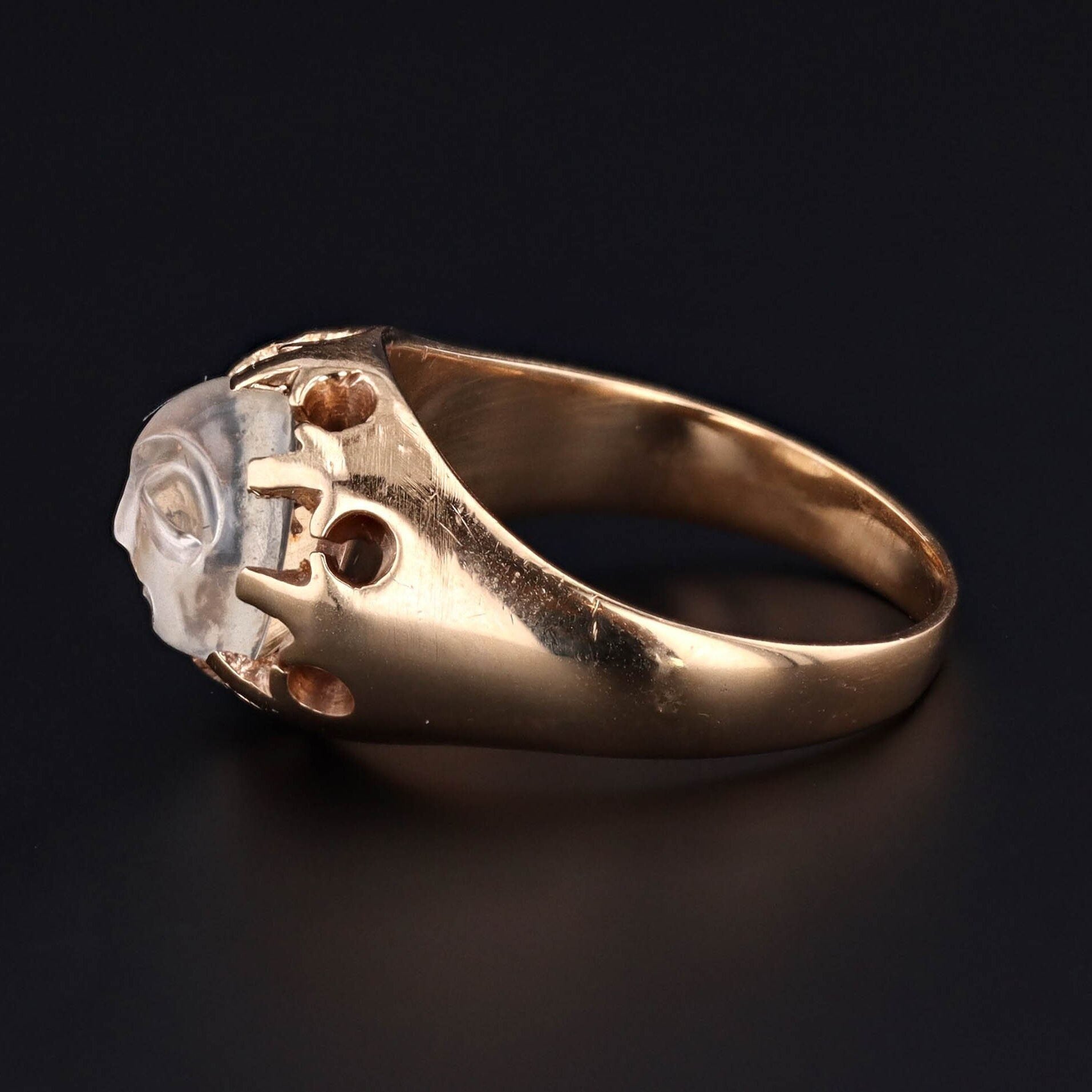 This alluring ring features a expertly carved iridescent moonstone face set inside of a simple yet elegant 10k yellow gold band. The mounting dates to the 1950s, while the moonstone is a later replacement.