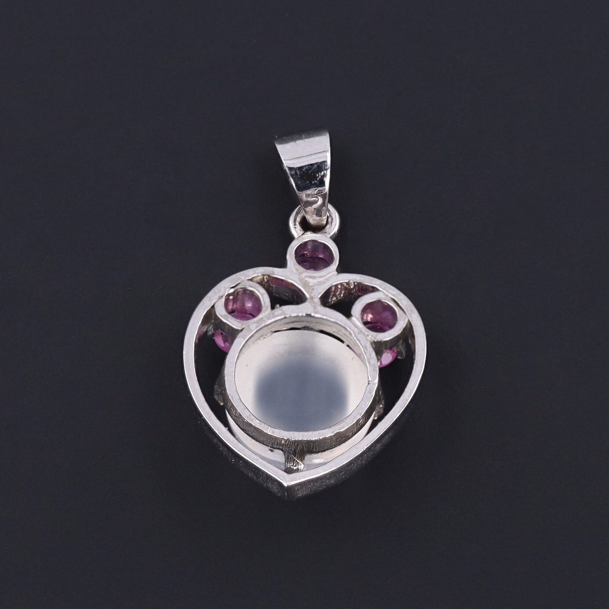 Radiant with romantic symbolism, this vintage love token pendant (circa 1980) is crafted in silver and designed as a heart, centered by a luminous moonstone cabochon that glows with ethereal light. Three pink-hued rubies accent the design, their vibrant color adding warmth and passion to this tender jewel.