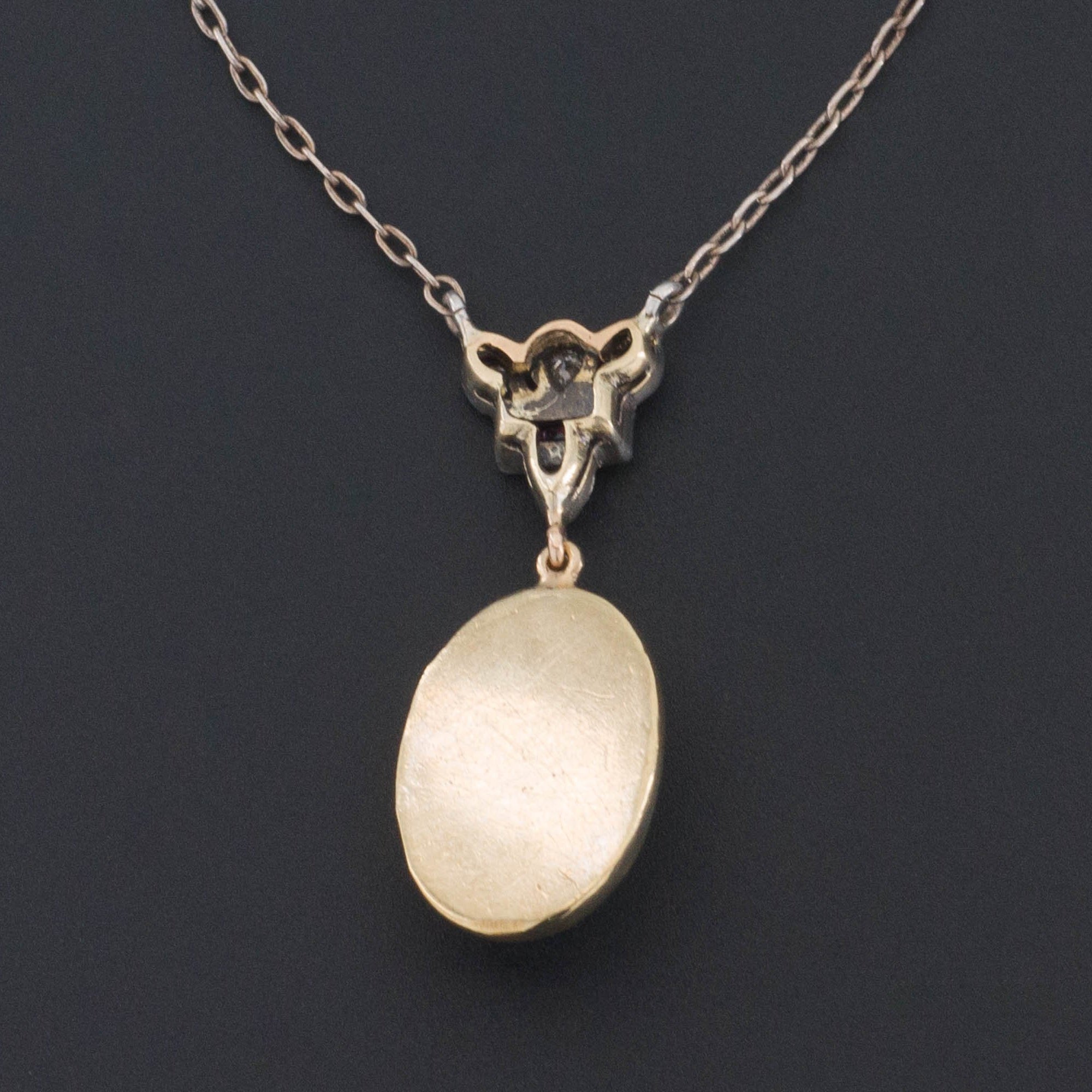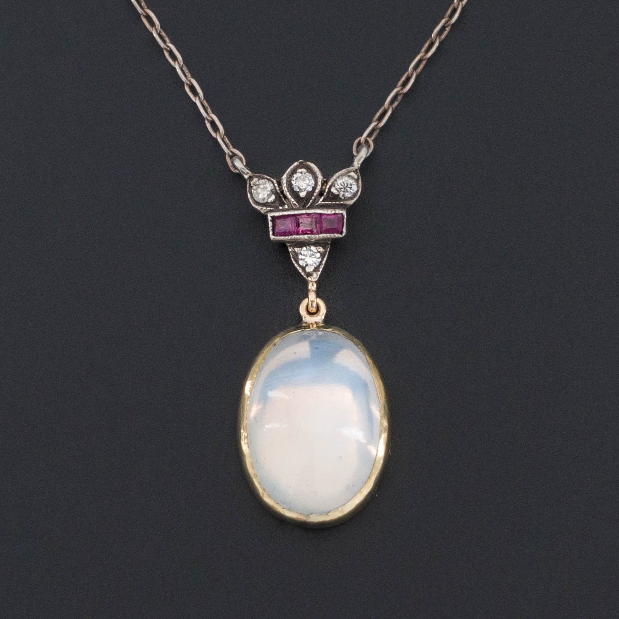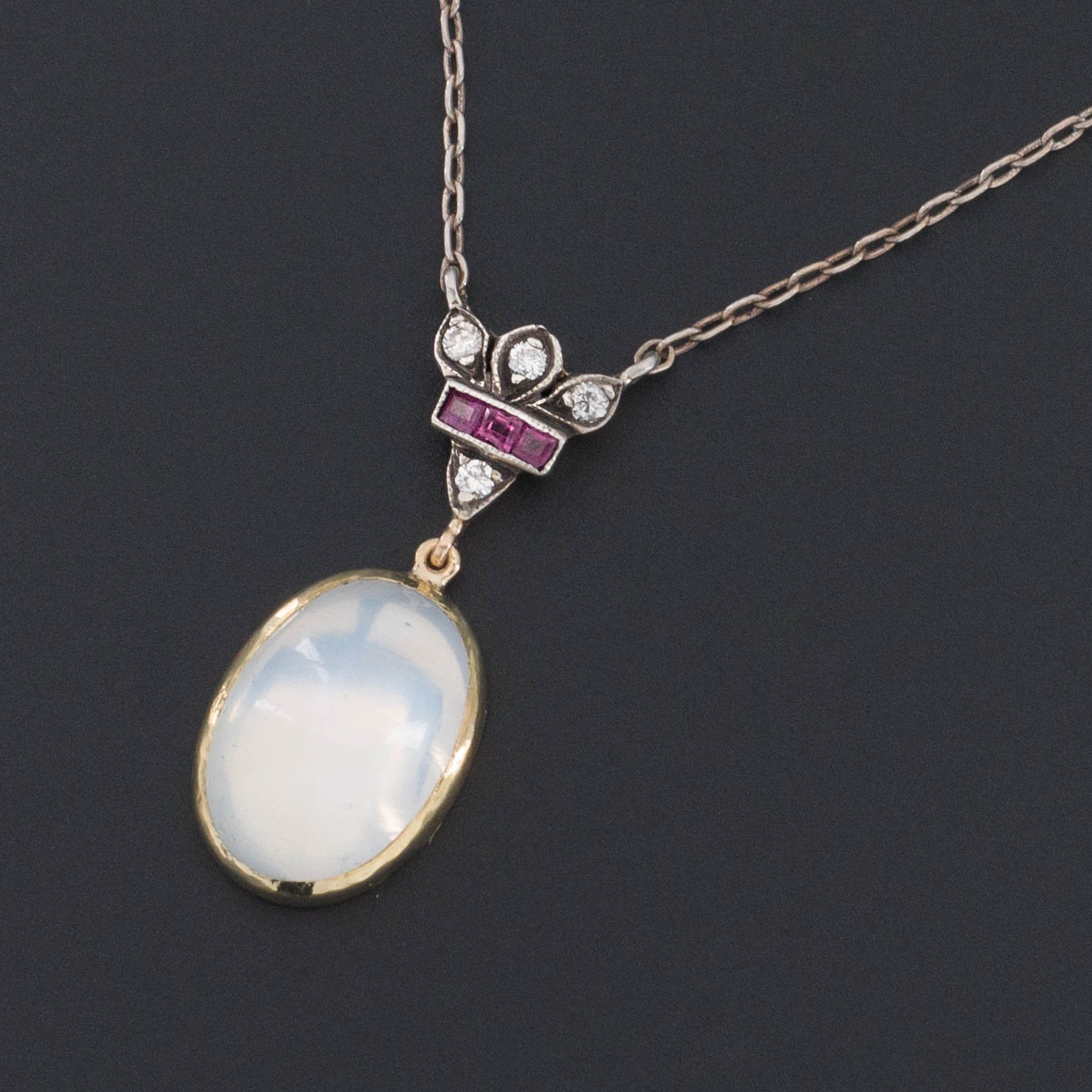 This luminescent jewel was created from antique jewelry components. It features a mesmerizing closed back moonstone set in 14k gold hanging from a silver topped 14k gold ruby and diamond surmount (circa 1915-1920). The repurposed chain is sterling silver.