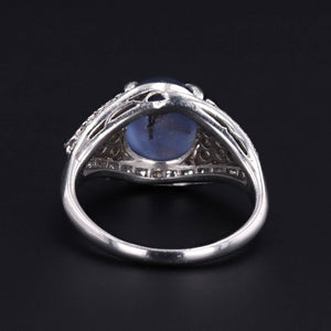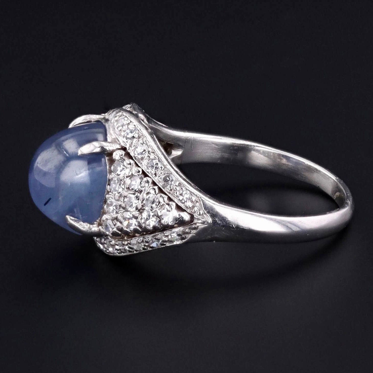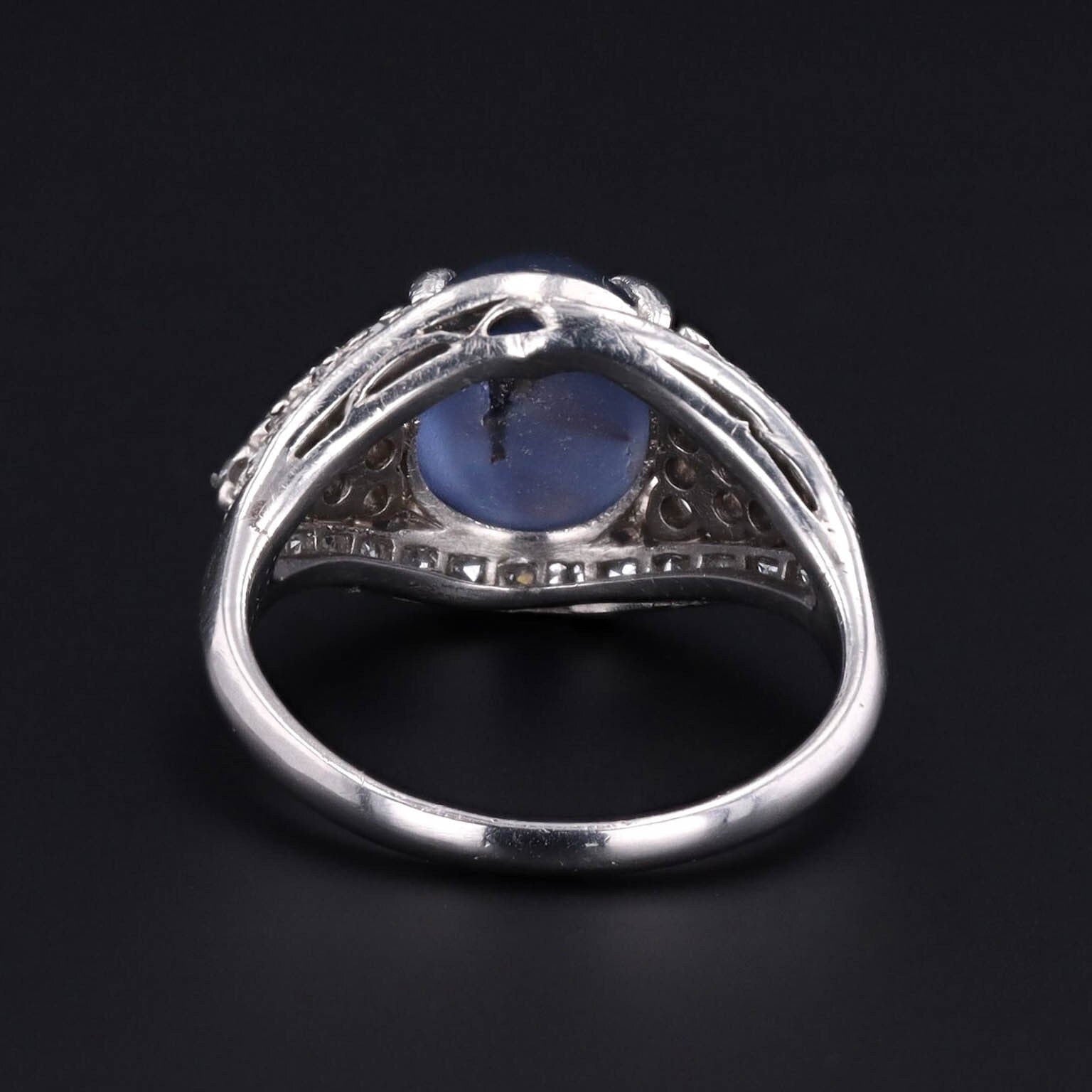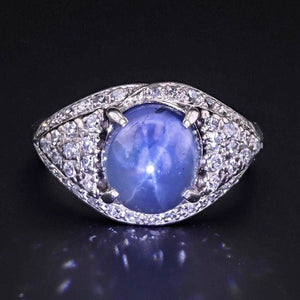 Set in platinum, this vintage star sapphire (circa 1920s) is accompanied by numerous glittering diamonds.