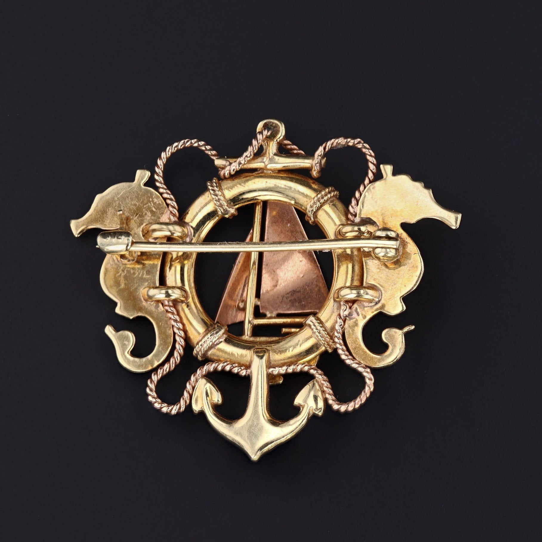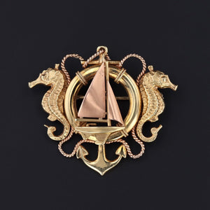 A perfect jewel for anyone with a passion for sailing or fondness for the ocean, this gold brooch by the renowned Sloan & Co. depicts a sailboat with a life preserver and anchor flanked by two finely rendered seahorses. Seahorses are symbols of patience and contentment.