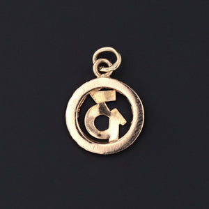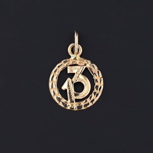 This lucky number 13 charm (circa 1970) measures 0.7 inches from the top of the jump ring bail to the bottom of the charm by 0.5 inches wide. It is 14k gold (unmarked but acid tested) and in very good condition. The charm weighs 0.6 grams.
