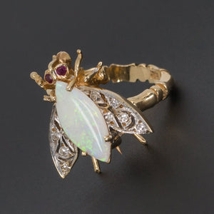 This attractive ring features a large opal and 14k gold bee, aglitter with glistening diamonds. The brooch can be removed and worn as a pin, or attach to the band as a ring.