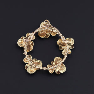 Expertly crafted in 14k gold, the piece measures 1.4 inches by 1.4 inches. The enamel work is beautifully preserved, though one of the blue pansies shows a discreet chip visible only upon close inspection.