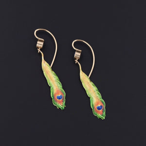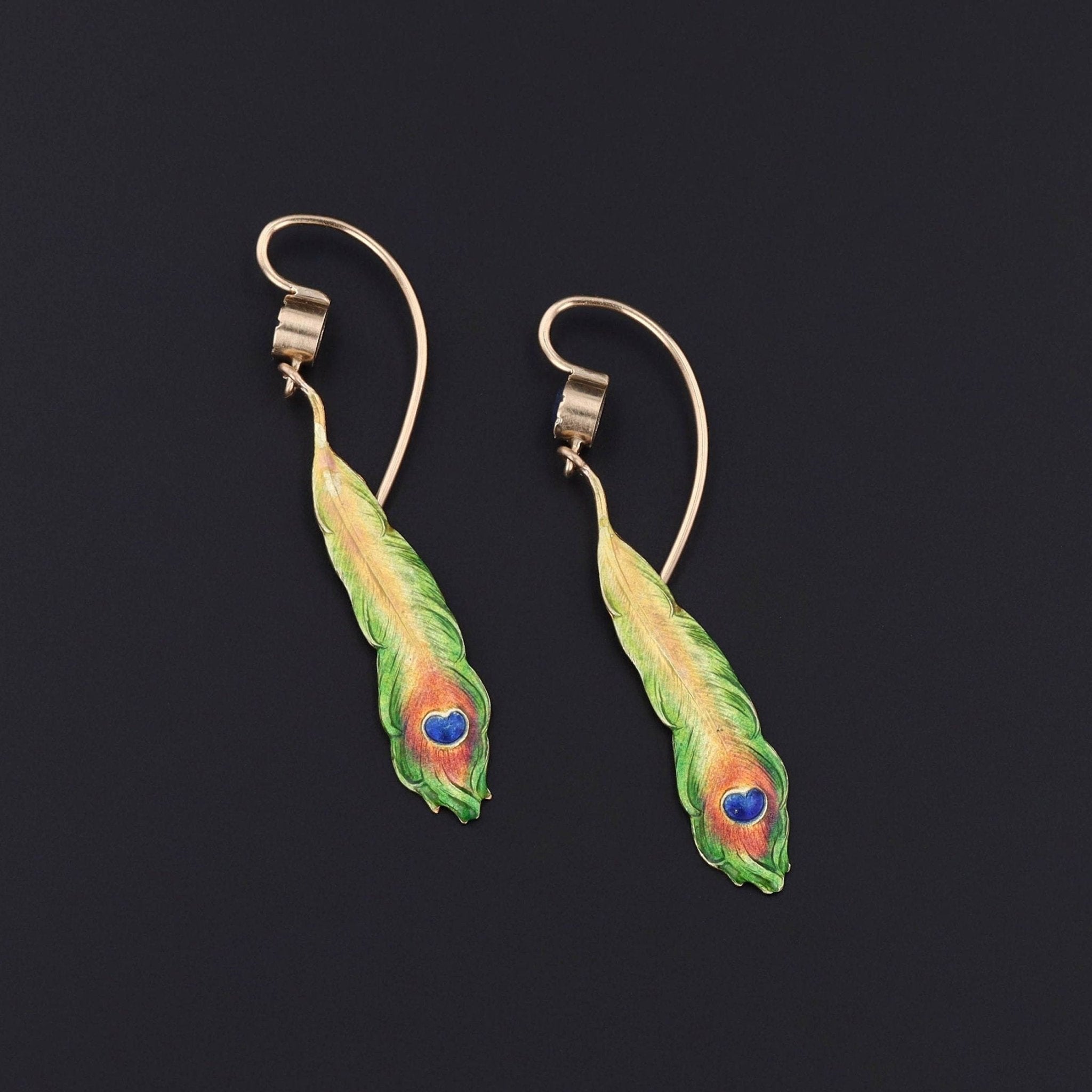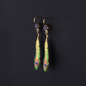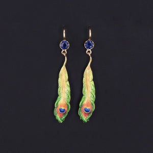 These stunning earrings were thoughtfully converted from antique pins (circa 1910) into a graceful and wearable pair of drop earrings. Each earring features a peacock feather motif in solid 14k gold, richly detailed with vibrant enamel, and suspended from a faceted sapphire surmount that adds just the right touch of sparkle.