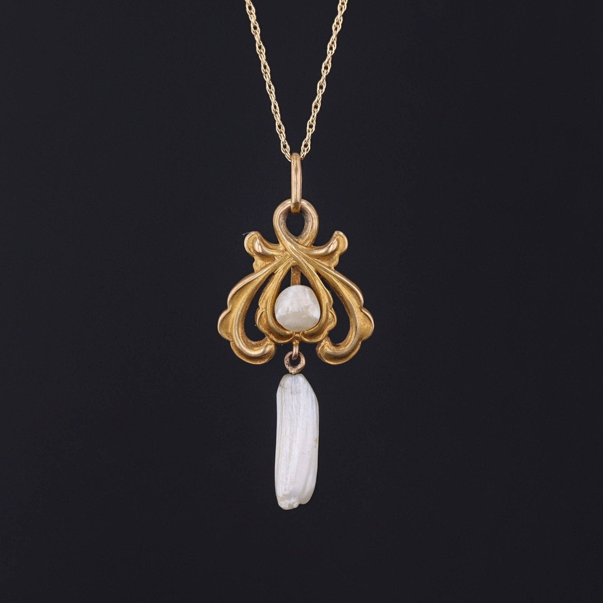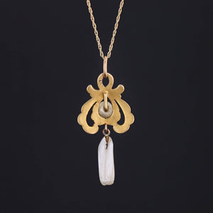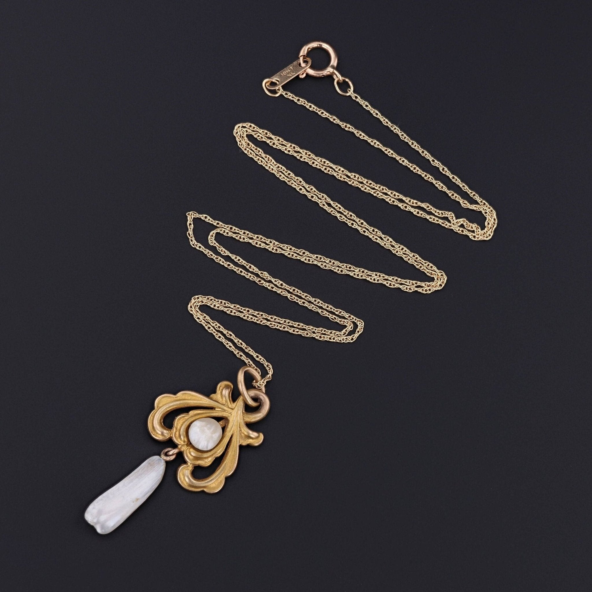 This antique necklace (circa 1910-1920) features a 14k gold pearl lavalier pendant measuring 1.4 inches from top to bottom by 0.6 inches wide.
