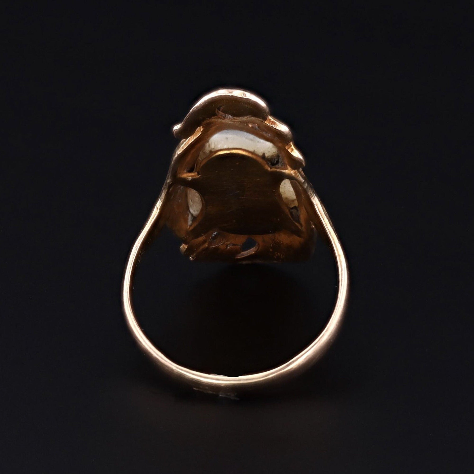 This delightful baroque pearl and diamond ring dates to the early 1900s (circa 1900-1910). The band was made in an asymmetrical floral design to fit the contours of the pearl.