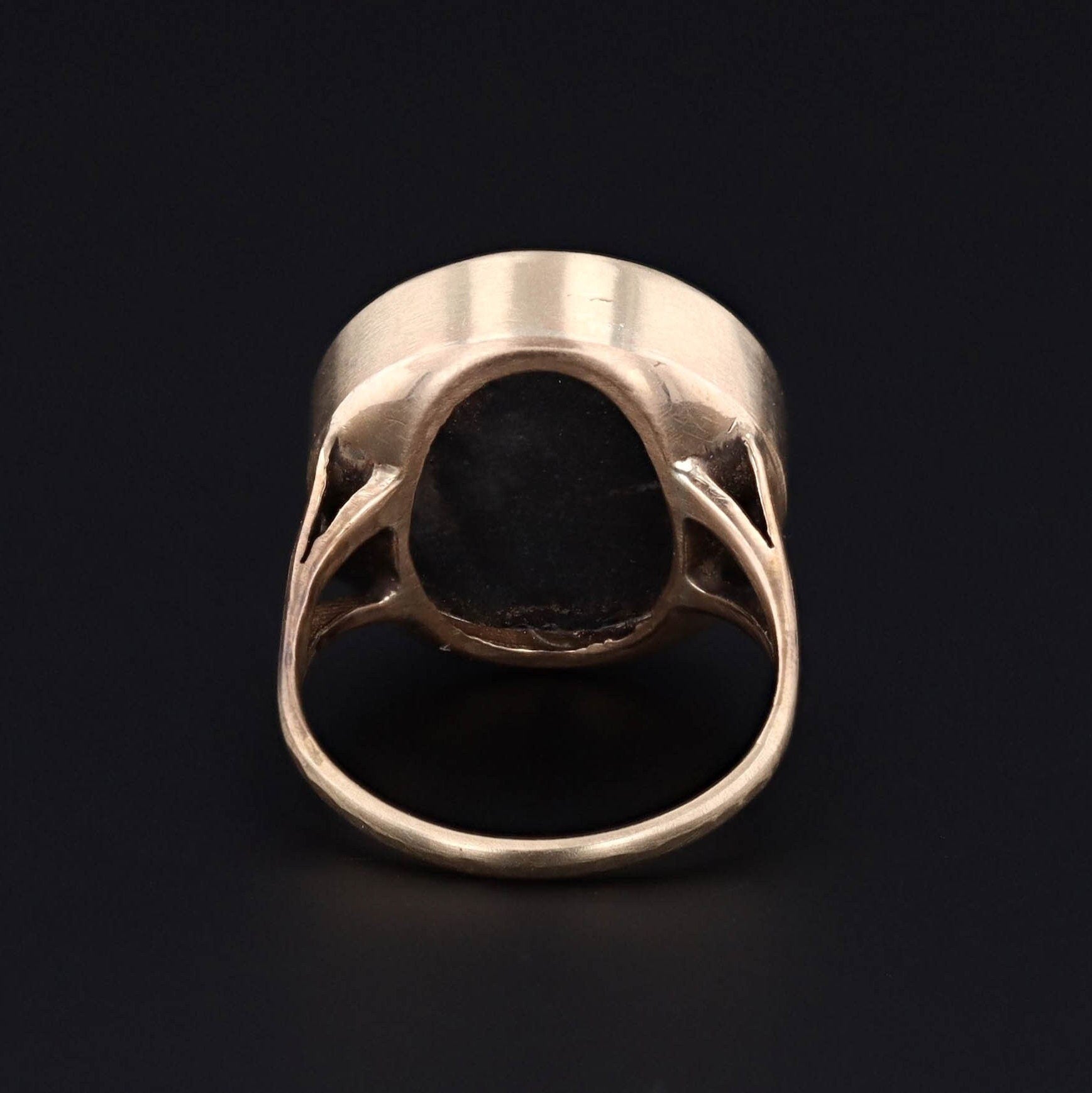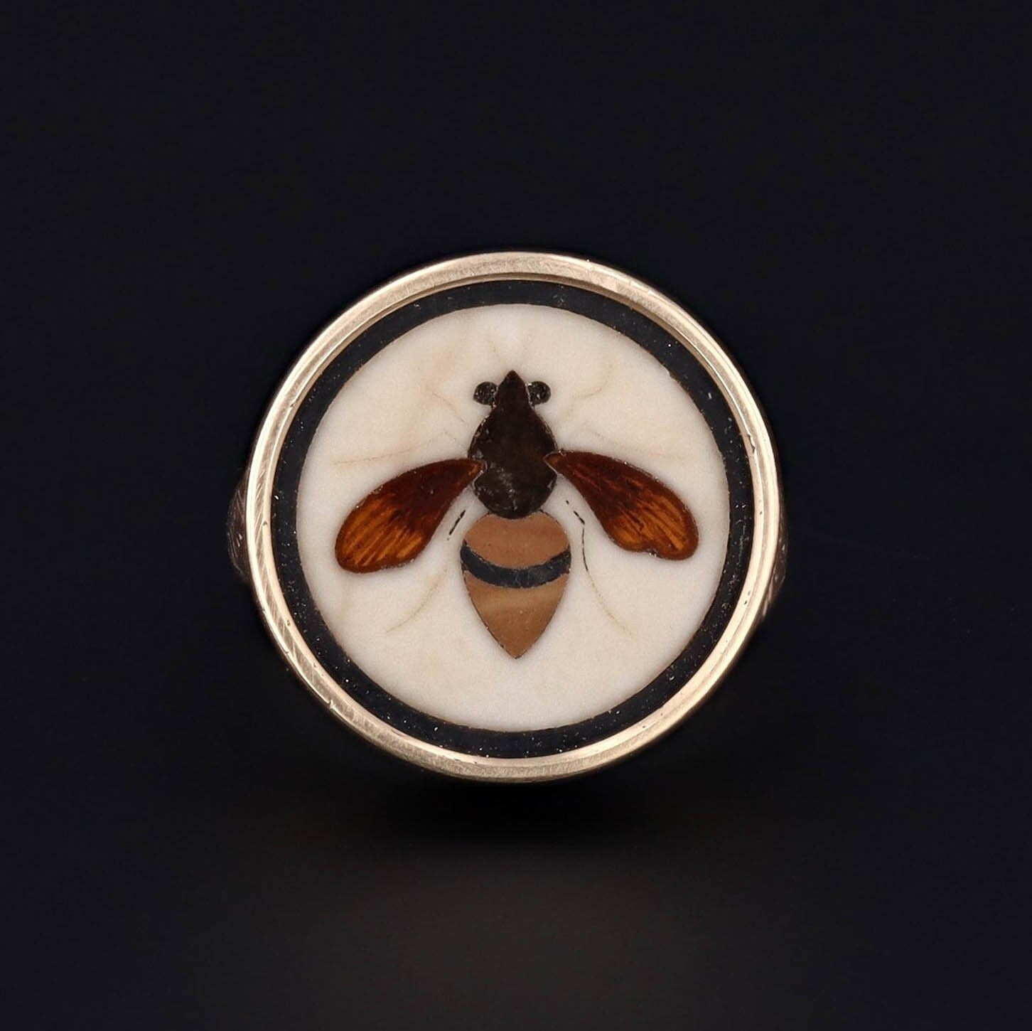 The intriguing ring was created from an antique pin (circa 1870-1890) that our jeweler transformed by mounting it in 14k gold and adding an antique 14k gold ring band. The bee on the face of the ring is pietra dura -- a decorative art that involves cutting and shaping pieces of colored stone in a precise mosaic.