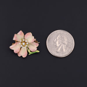 This antique 14k gold brooch (circa 1910) by Bippart & Co. features a flower adorned in pale pink and green enamel accented with pearls and a single glistening diamond.