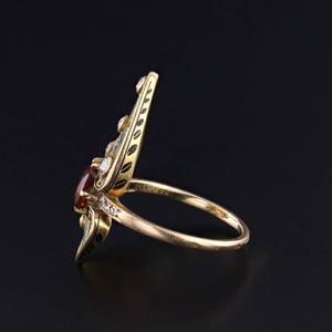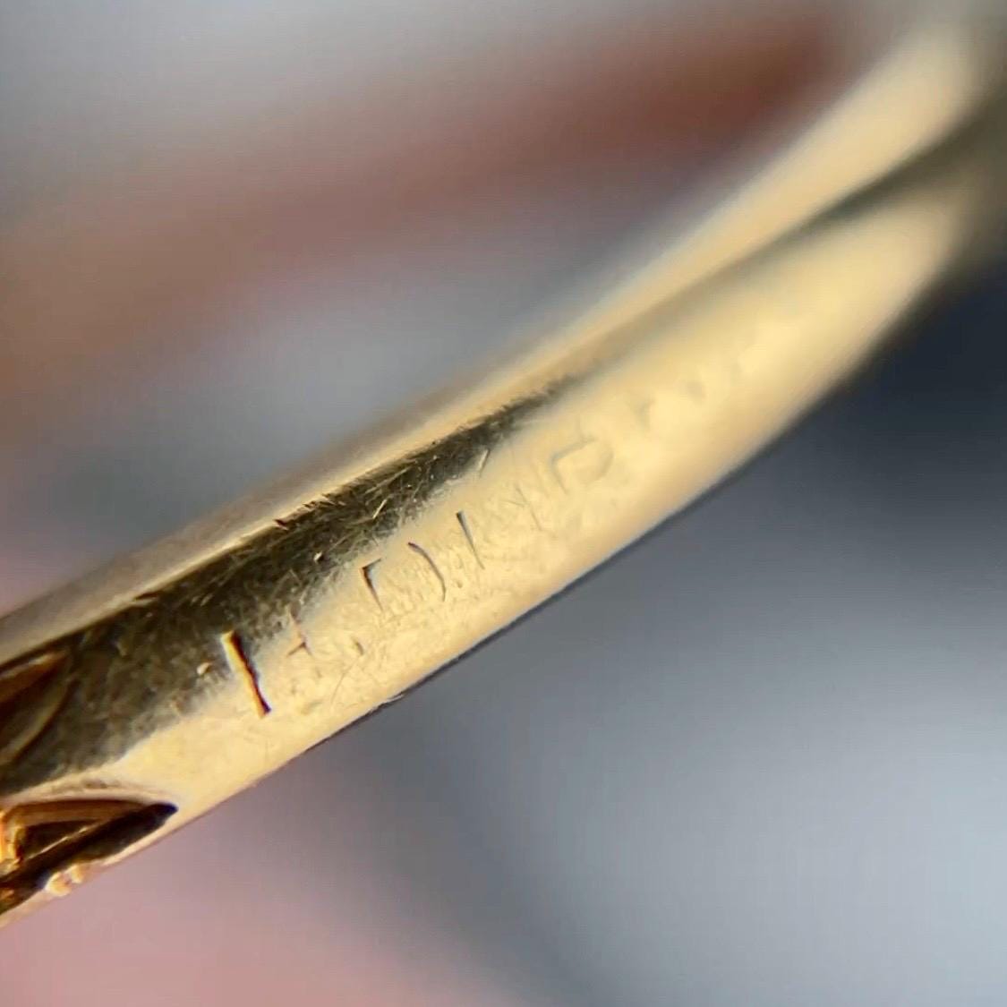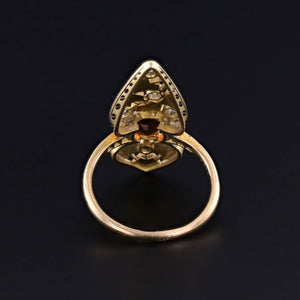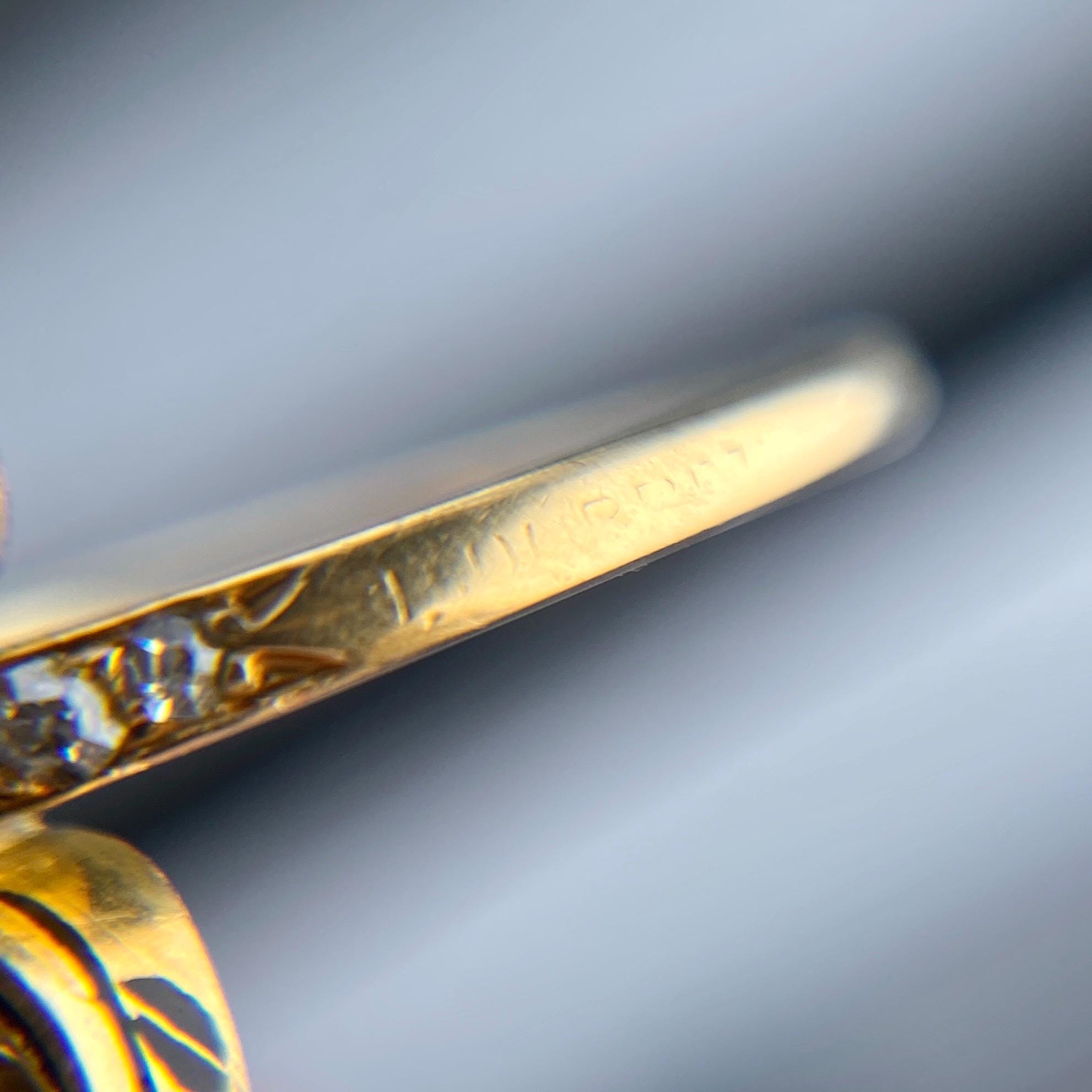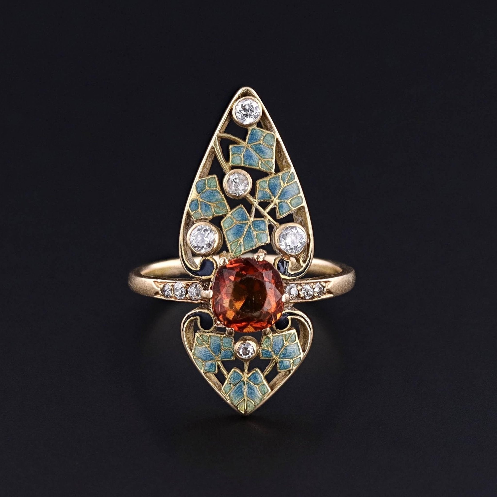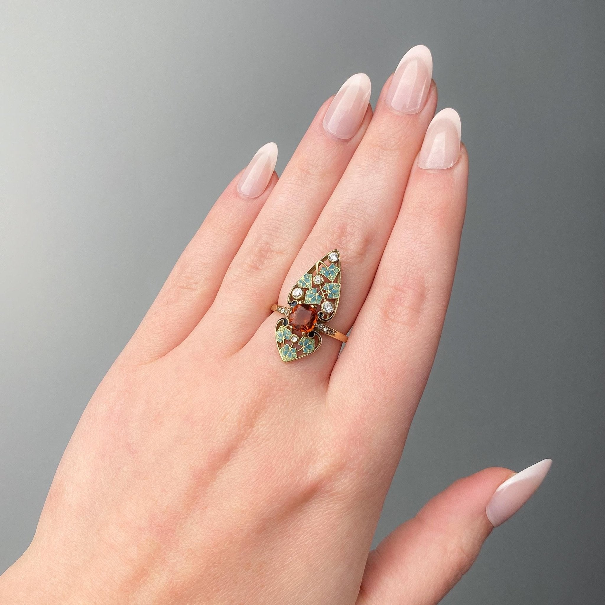 Antique Henri Dubret Ring: This sophisticated 18k gold ring by the renowned French jeweler Henri Dubret is an miniature masterpiece adorned with enamel ivy leaves, glittery old cut diamonds, and a vibrant cushion-cut citrine. The ring (circa 1905-1910) is signed H. Dubret on the exterior of the shank. It is also stamped with the French eagle's head mark.