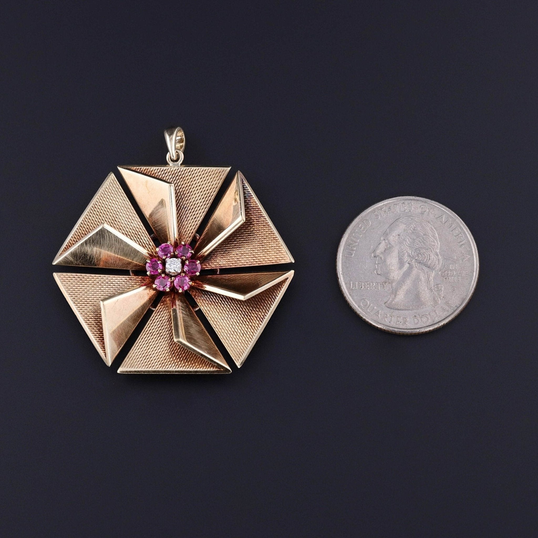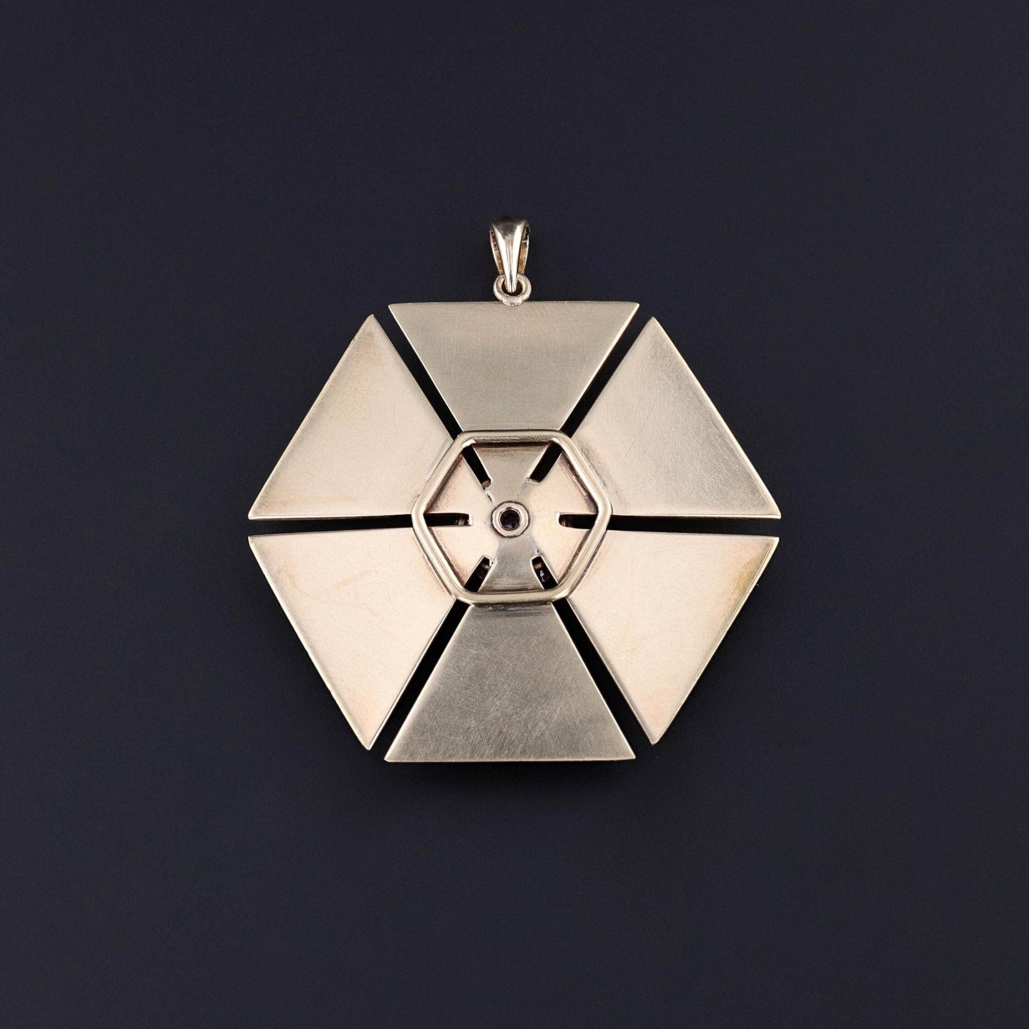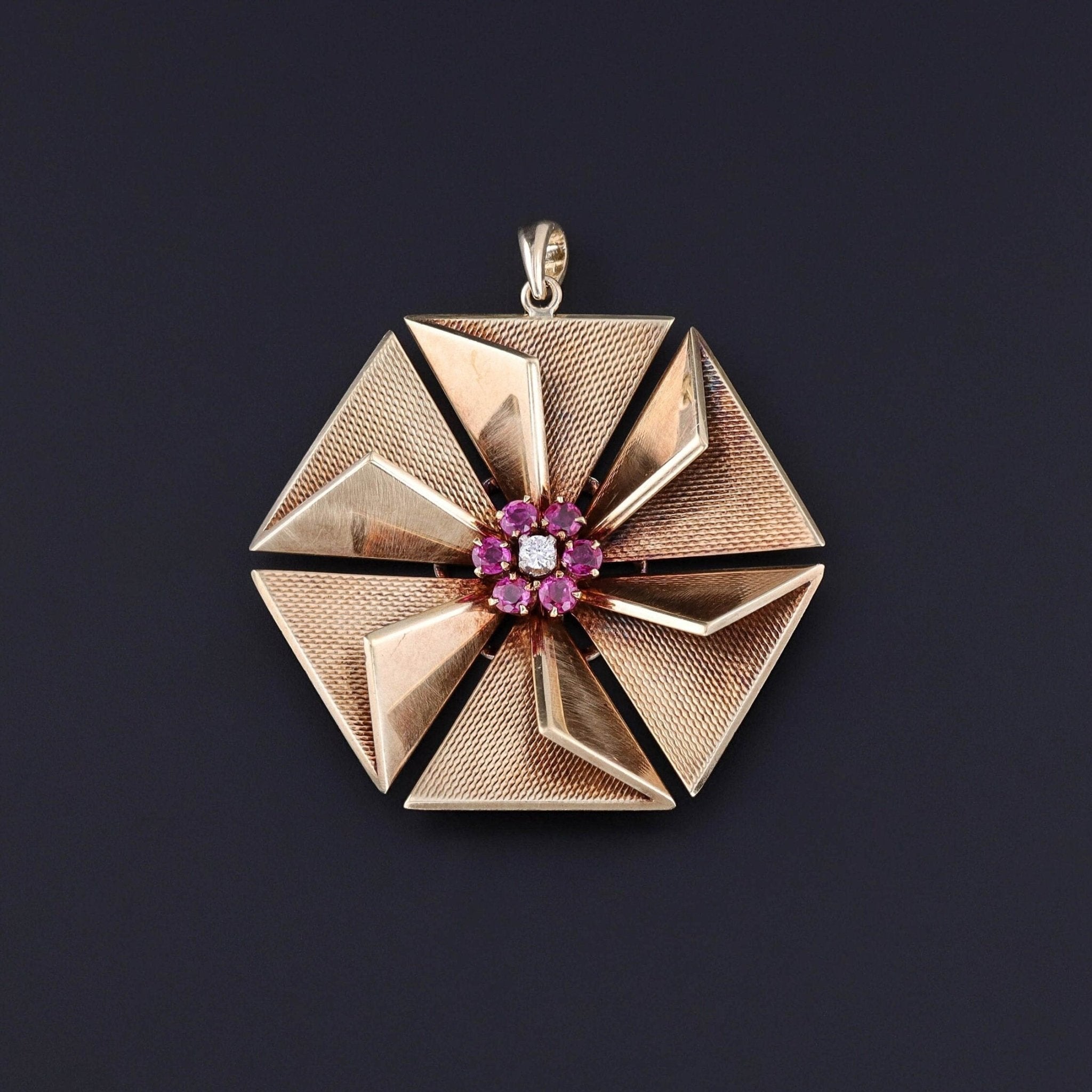 This vintage pendant (circa 1940-1950) features a hexagon of 14k gold with rubies and a single diamond accent.