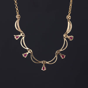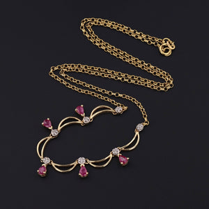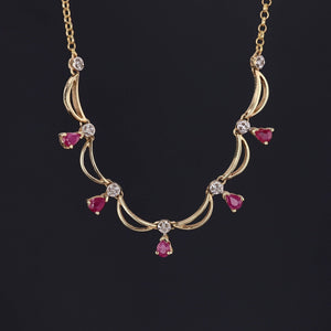 This vintage necklace (circa 1980) features single cut diamonds and pear shaped natural rubies set in 14k gold.