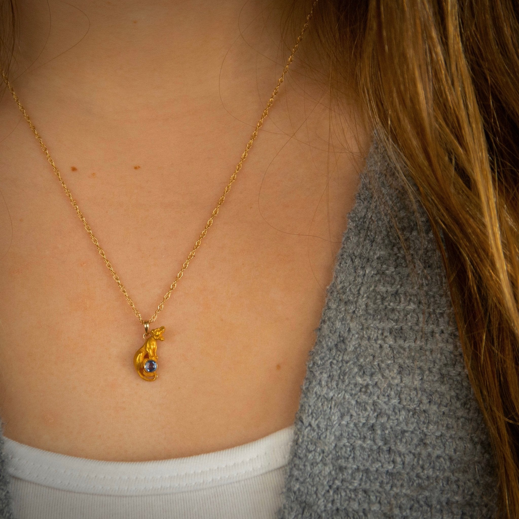 This wild cat is rendered of 14k gold and measures 0.7 inches from top to bottom by 0.4 inches wide. It was originally an antique stick pin (circa 1910-1920) transformed with the addition of a 14k gold bail.