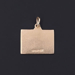 This vintage pendant (circa 1950-1960) features a scrabble board of 14k gold with accents of royal blue enamel. The tiles spell out 'I LOVE YOU'.