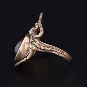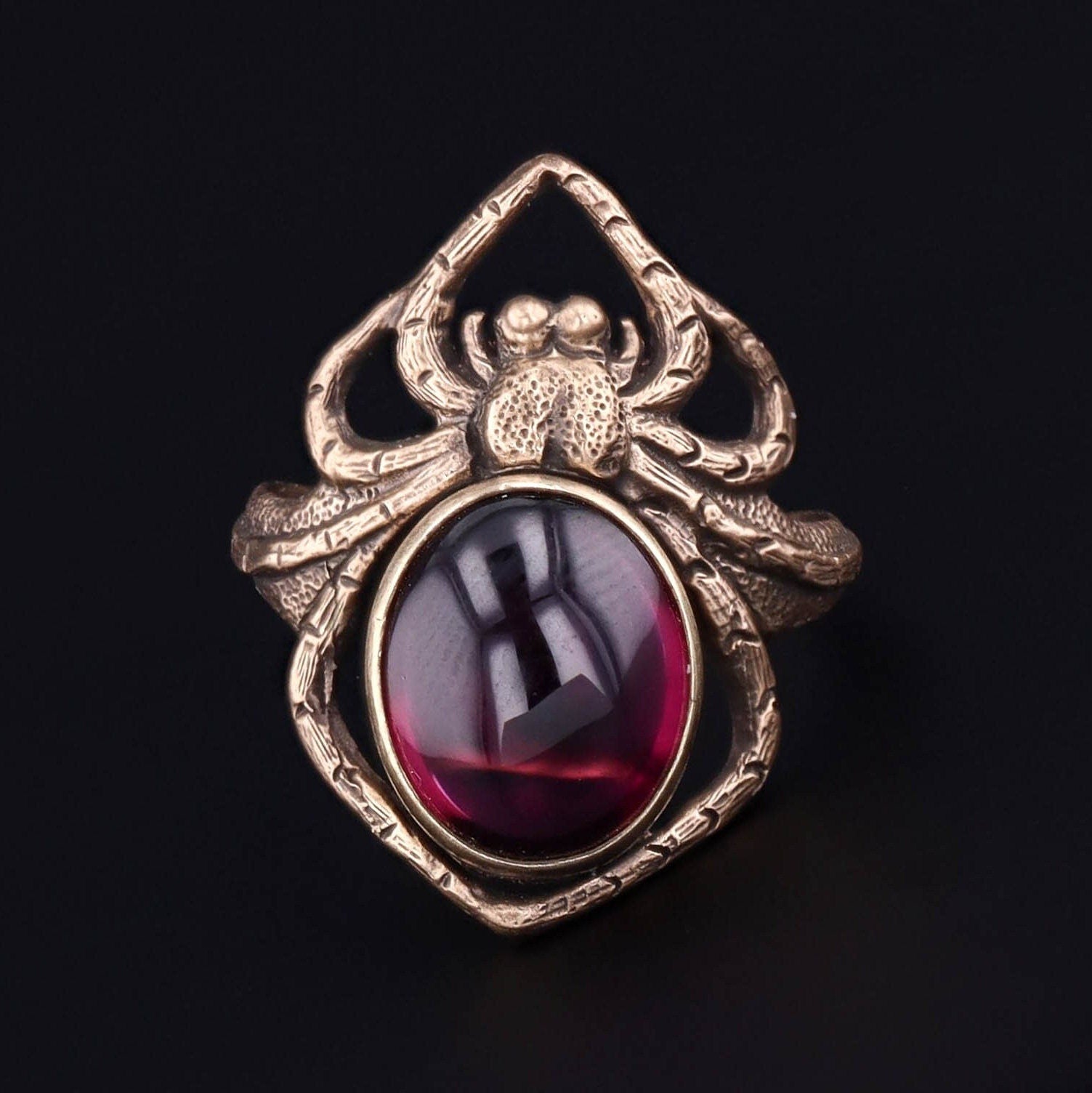 This beguiling spider ring is 14k gold with a dramatic garnet accent. This ring was one of several that our jeweler cast and reproduced from an Art Nouveau era ring.