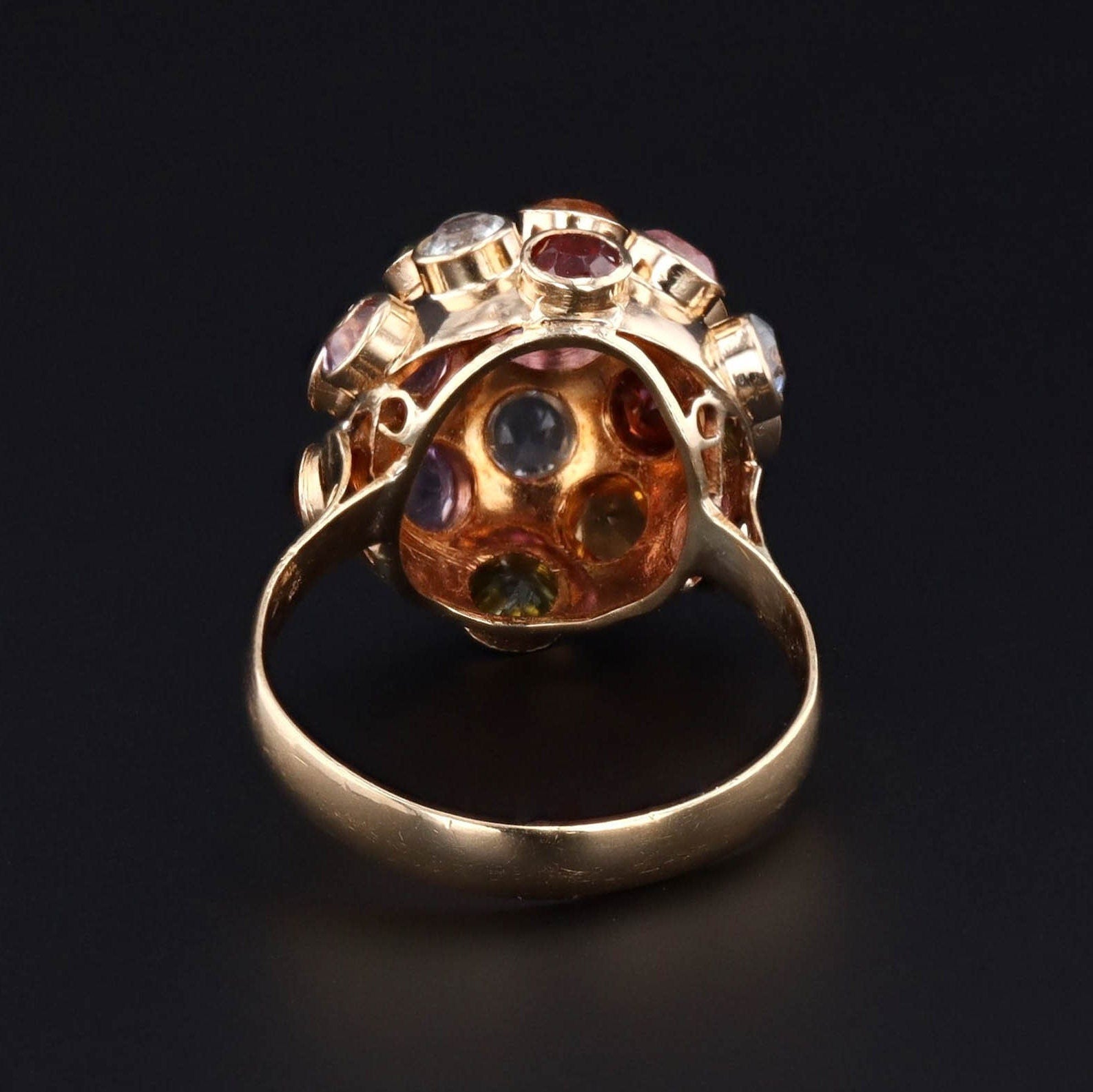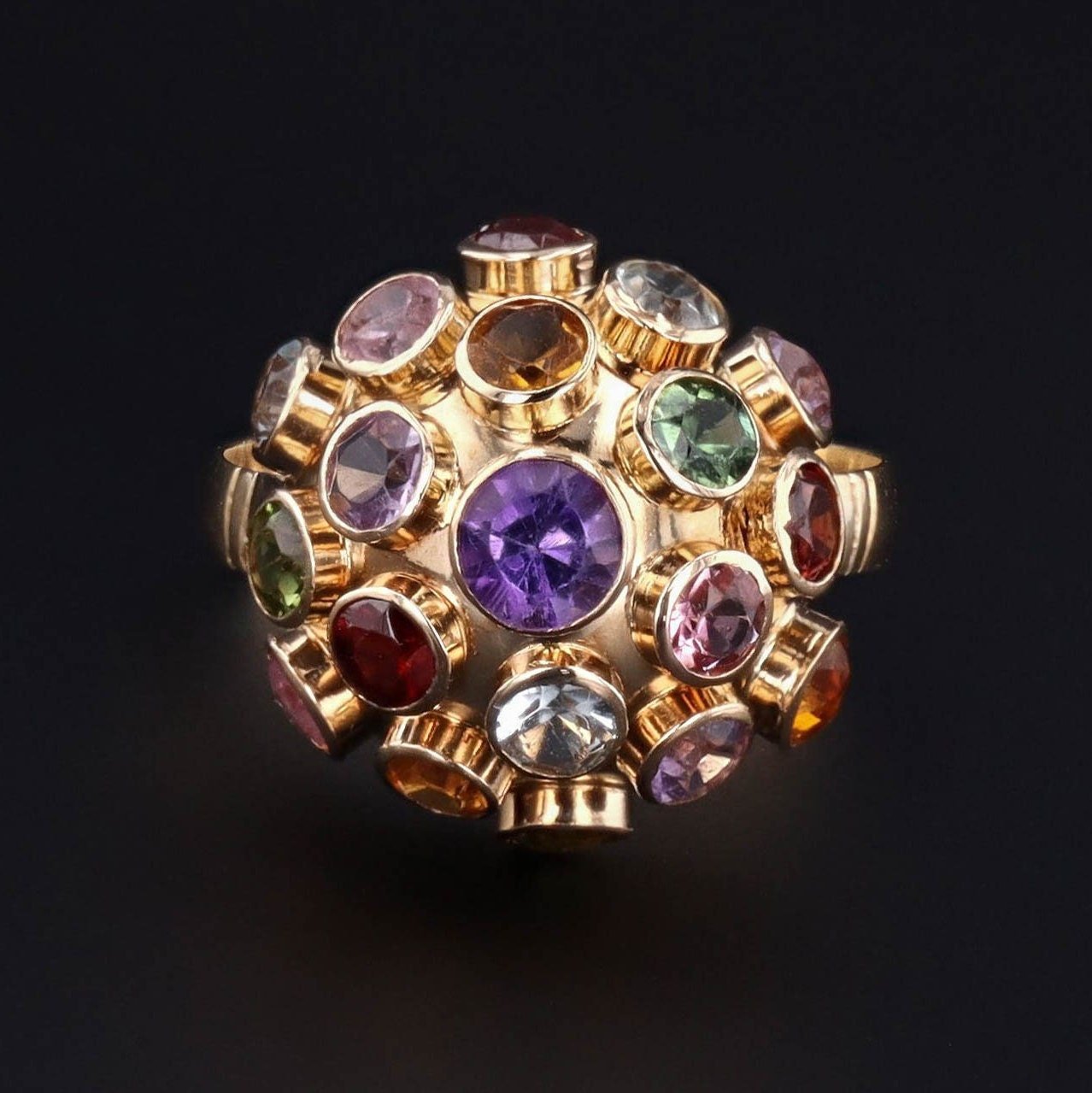 This "Sputnik" bombé-style ring dates to the 1960s. The small sized Sputnik ring is 18k gold (marked) and studded with colorful gemstones.