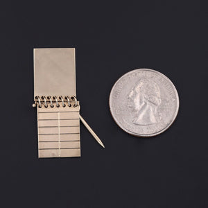 This vintage 14k gold charm (circa 1960-1970) features a finely detailed notebook that opens to expose lined "paper." It also has a tiny golden pencil attached to the spiral top of the notebook. The reverse bears the inscription 'Instructor'.