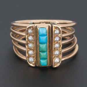 A fun five band Victorian ring with turquoise and pearl accents.