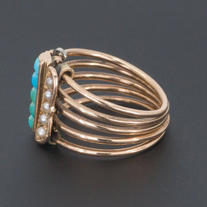The ring (circa 1880-1900) is unmarked, but acid tests for 14k gold. It features five hinged wire bands joined together by a front panel decorated with half pearl and turquoise accents.