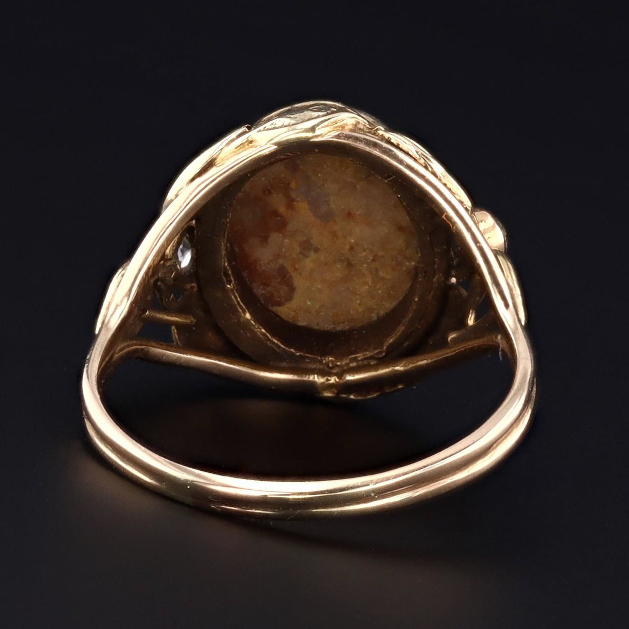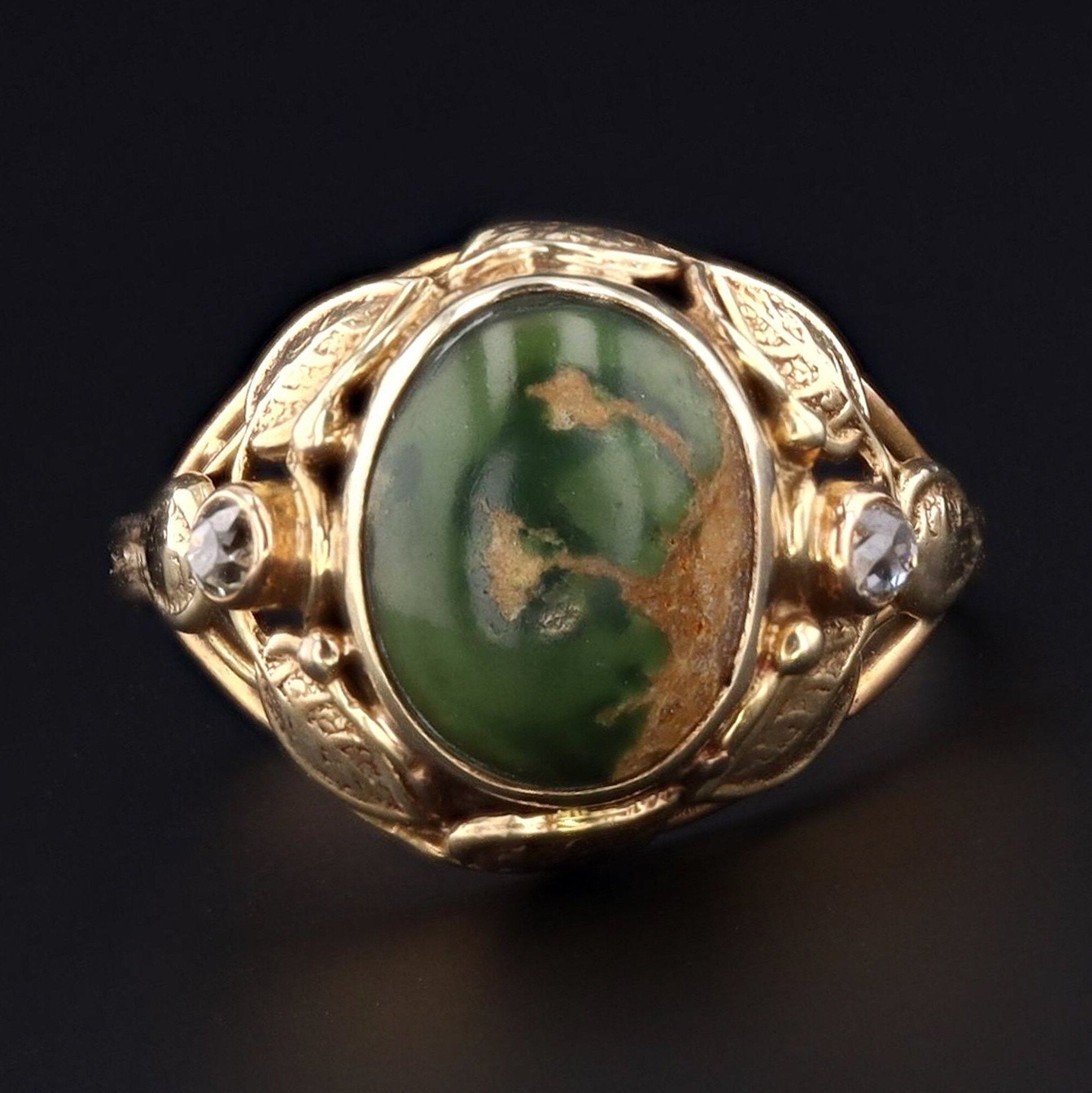 This ring features a hunter green hued turquoise cabochon in an ornate foliate designed mounting with diamond accents.