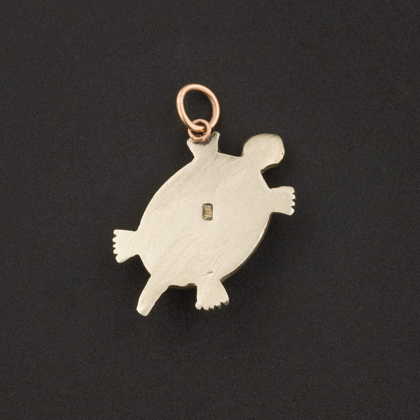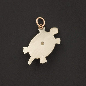 This charming silver turtle is accented with turquoise cabochons and has tiny red glass eyes. The turtle was originally an antique brooch that we transformed with the addition of a 10k gold jump ring bail.