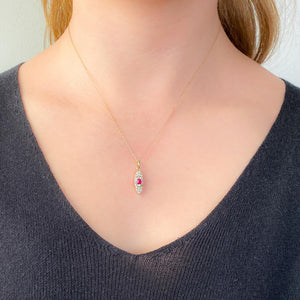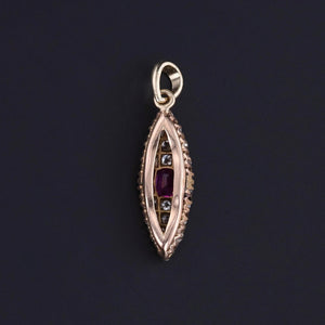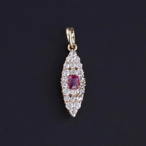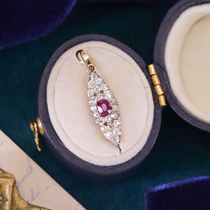 The pendant measures approximately 1 inch from the top of the bail to the base by 0.3 inches wide, weighs 1.5 grams, and remains in good antique condition. The ruby shows surface wear visible only under magnification, consistent with age and use.