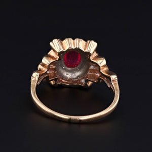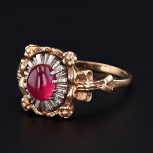 This attractive 1940s ring features an early synthetic ruby cabochon set inside a 10k yellow and white gold mounting.