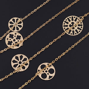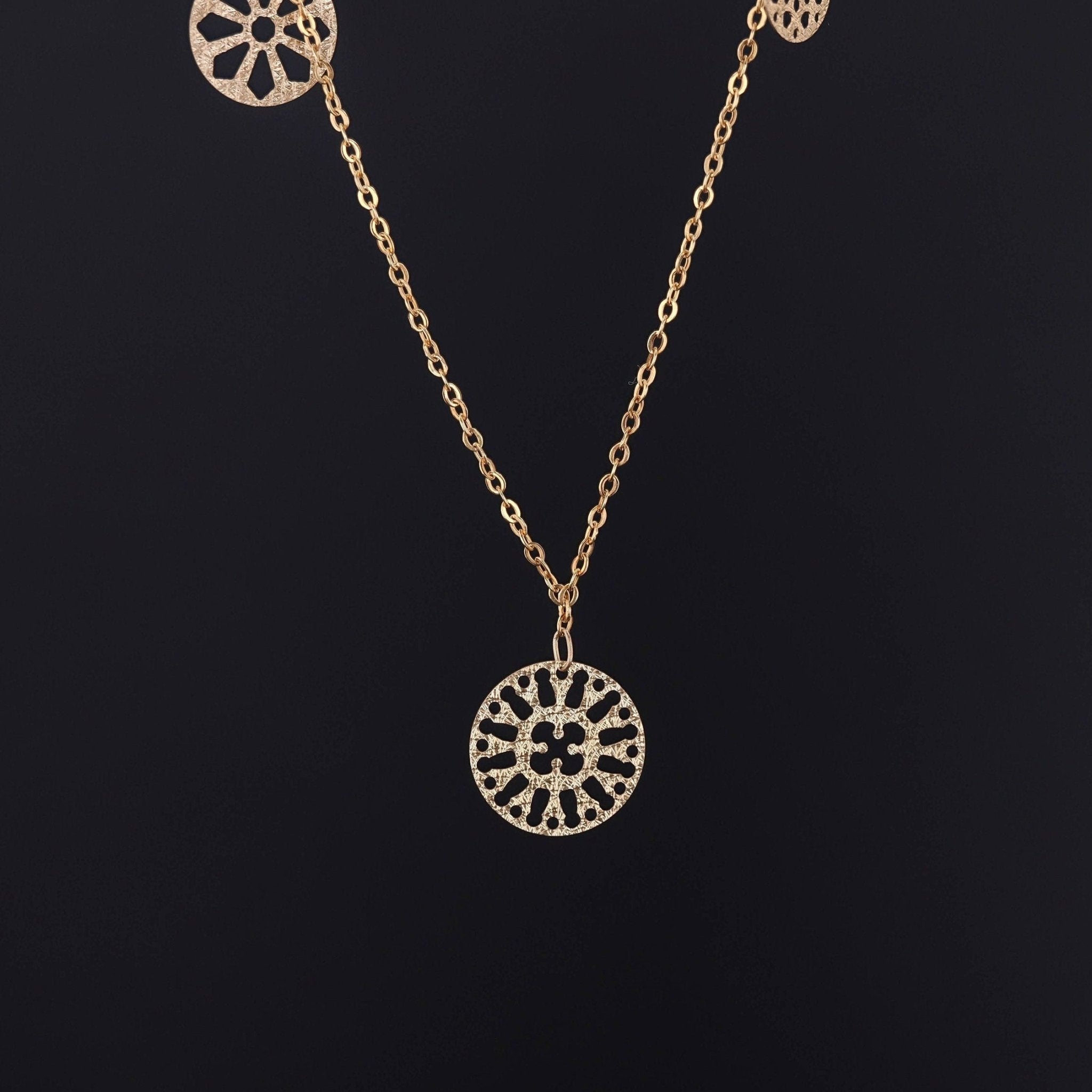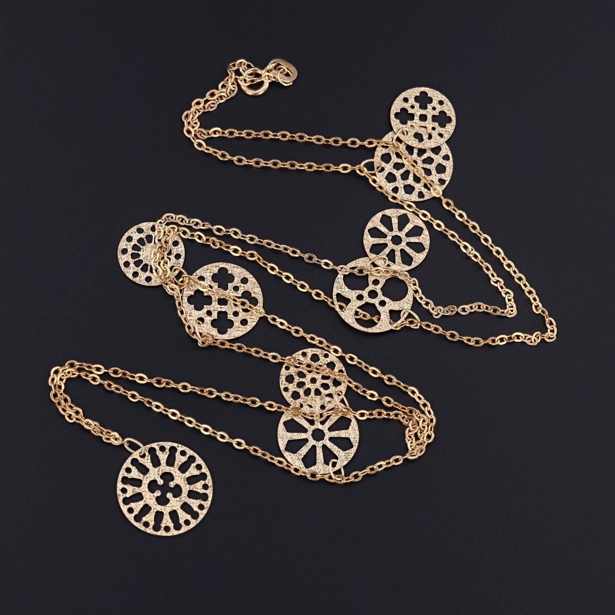 Timeless and radiant, this vintage necklace (circa 1990) features a series of polished round disc charms crafted in solid 14k gold, suspended from a sleek 24-inch gold chain. Each charm measures up to 0.5 inches wide, creating a subtle, rhythmic shimmer that catches the light beautifully with every movement.
