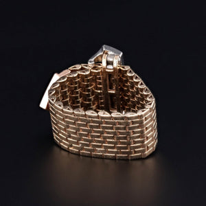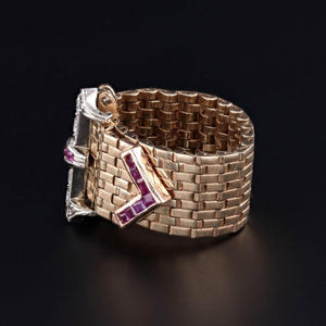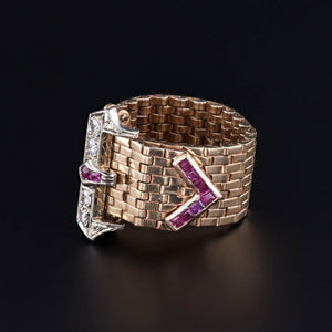 This retro belt buckle ring (circa 1940-1950) features an adjustable band of 14k yellow and white gold with diamond and ruby accents.