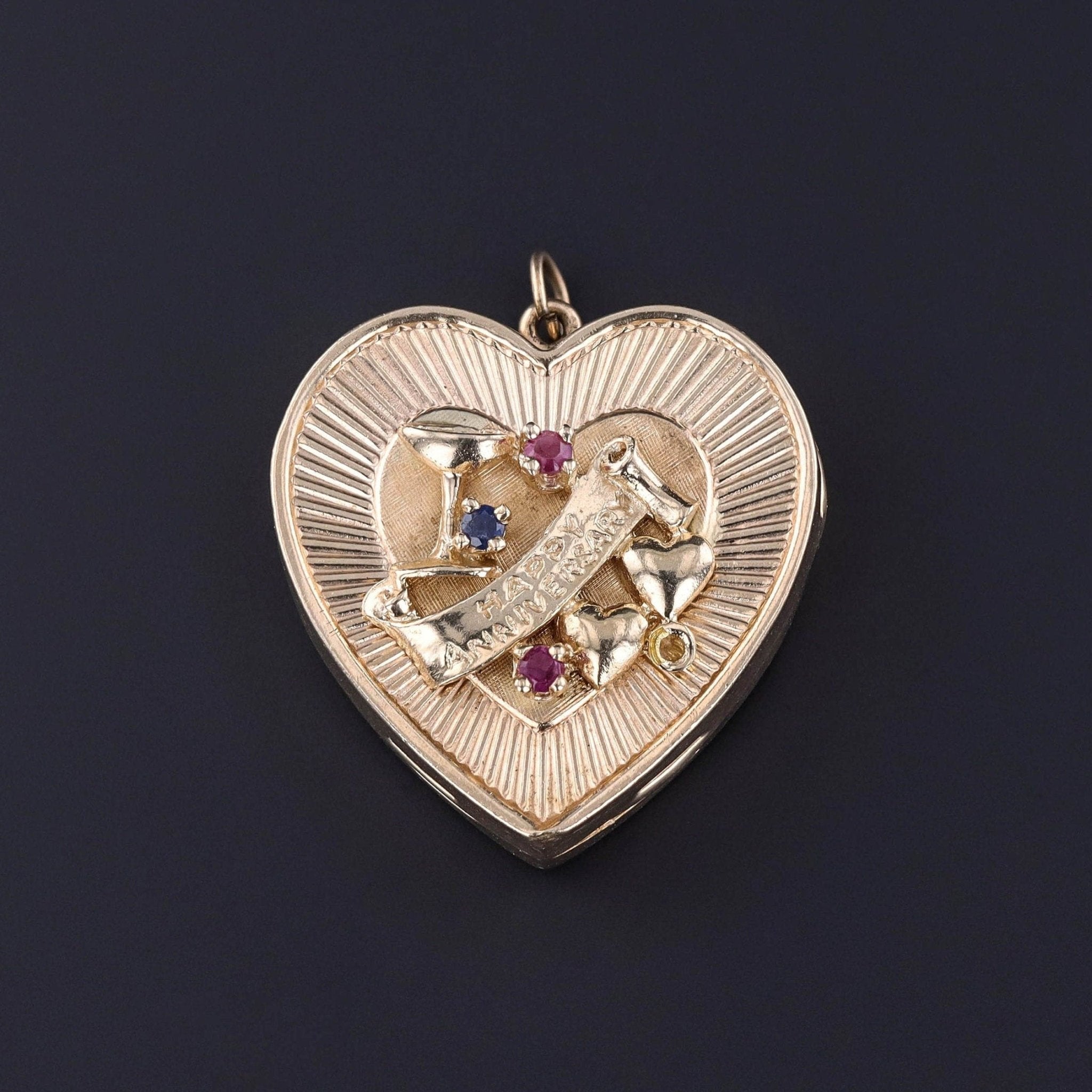 This vintage pendant (circa 1960-1970) features a heart shaped music box of 14k gold with two rubies, a sapphire and a banner reading 'Happy Anniversary'. The reverse is engraved with '50 Years 1-22-60 Love'. When you slide the switch and wind the crank, a beautiful song plays.