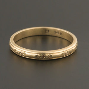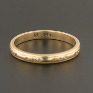 This lovely band (circa 1925-1935) is marked 14k and has a crisp floral pattern encircling the band. It is marked 14k and also bears an unknown maker's mark of "LM"