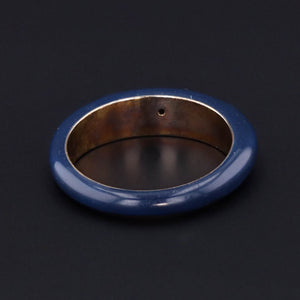 This vibrant enamel band (circa 1970-1990) is 14k gold with midnight blue enamel and golden heart, star, and crescent moon accents.