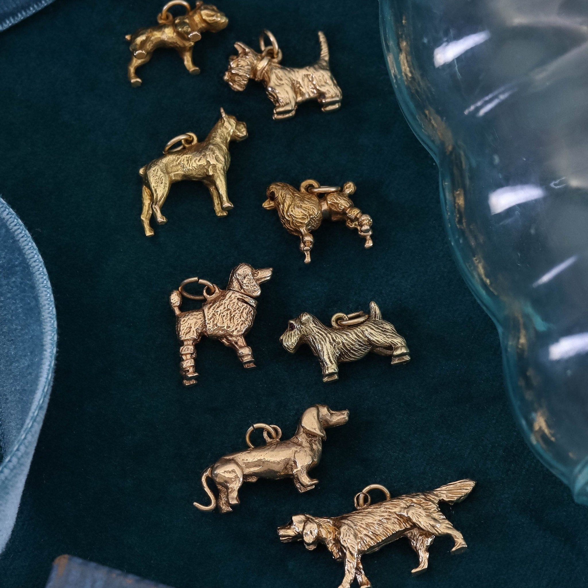 A bold yet endearing treasure, this vintage solid gold charm captures the noble stance and spirited personality of a boxer dog in finely detailed relief. Crafted in warm 14k yellow gold, the piece has a satisfying weight and presence, making it equally suited for a statement charm bracelet or as a pendant on a fine chain.