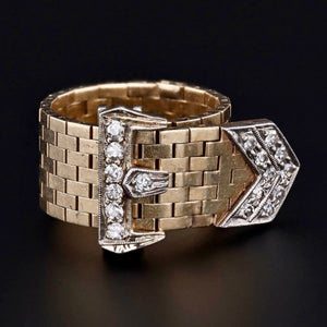 This vintage belt ring (circa 1950-1965) features an adjustable band of 14k yellow and white gold with a glittery diamond buckle. The ring size adjusts by lifting the hinge and buckling a small post into one of 4 locations allowing the ring to be worn between a size 4 and a size 7.5.