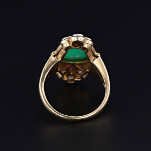 This vintage 18k gold ring (circa 1930-1940) features a chrysoprase cabochon with rubies, diamonds and black and green enamel accents. The ring bears the makers mark for the renowned Jones & Woodland of Newark, NJ.