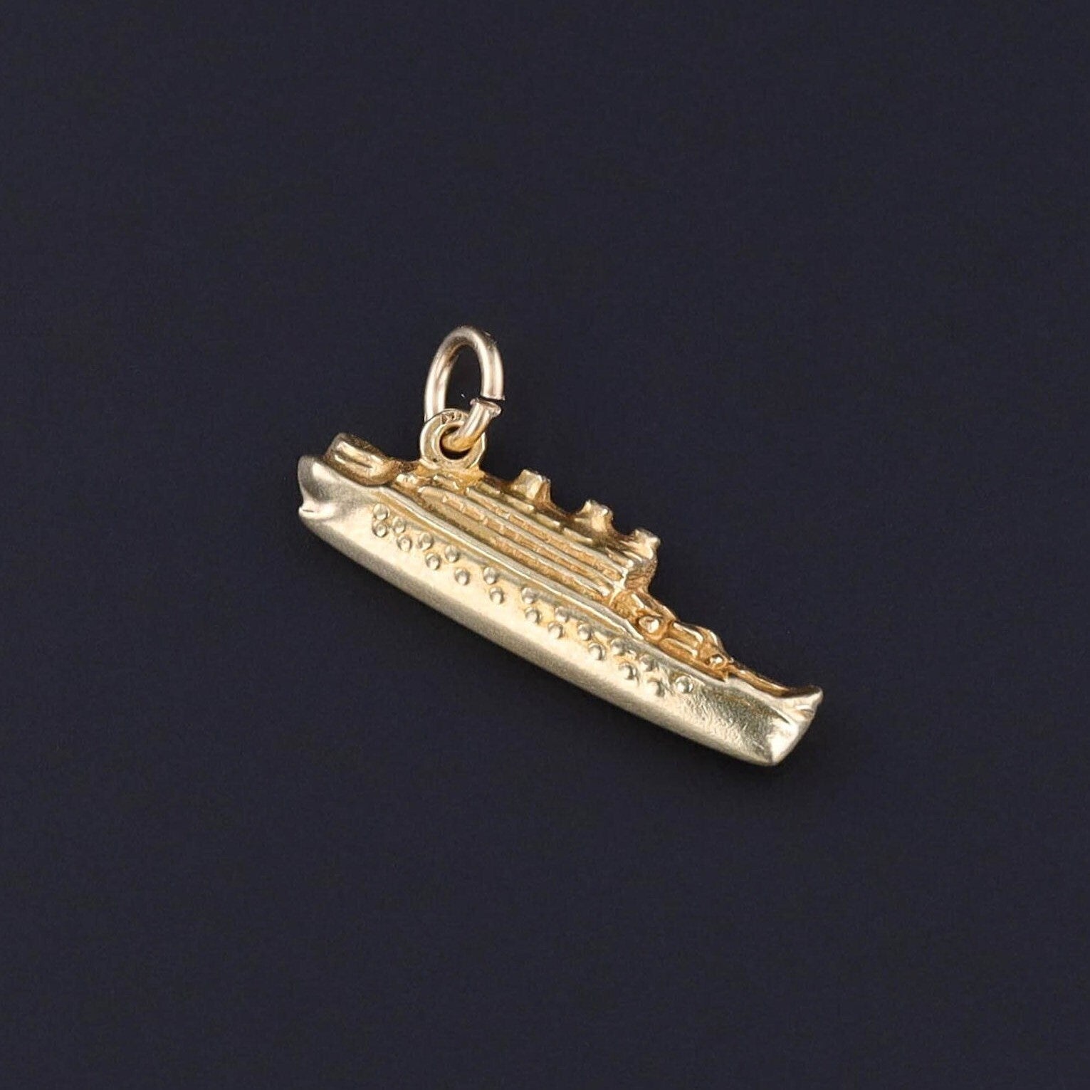 Evoking the golden age of travel, this vintage cruise ship charm (circa 1950s) captures the romance of mid-century ocean voyages. Finely crafted in 14k gold, it is a whimsical yet elegant jewel, perfect for the collector who values both charm bracelets and travel-inspired symbolism.