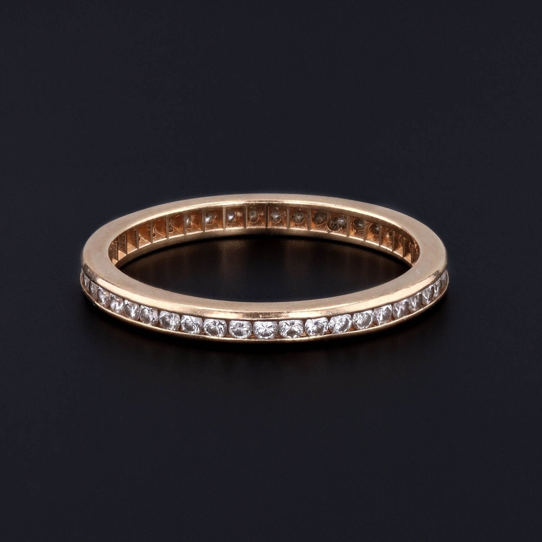 Timeless in design and enduring in meaning, this vintage eternity band (circa 1980–1990) features a continuous circle of glittering diamonds, symbolizing everlasting love and commitment.